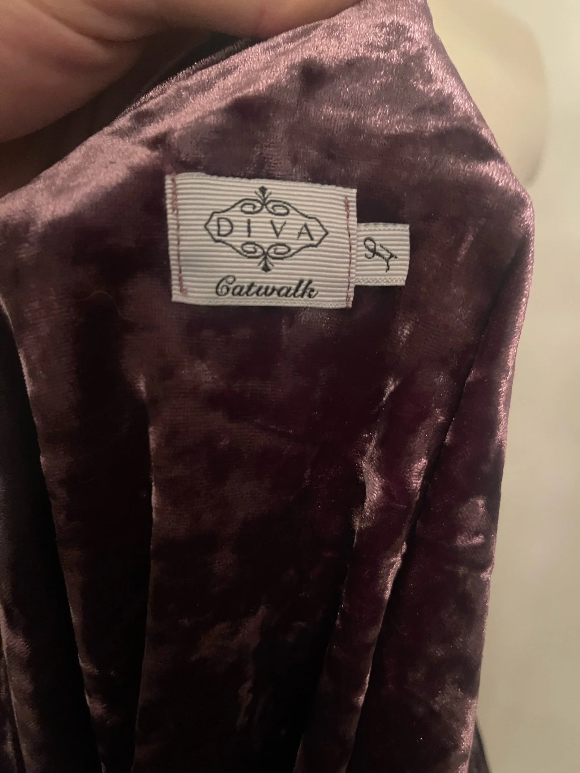 Step into timeless elegance with this stunning early 2000s Diva Catwalk velvet maxi dress. Crafted from luxurious stretch velvet in a deep, crushed lilac hue, this dress drapes beautifully and catches the light for an effortlessly glamorous look.