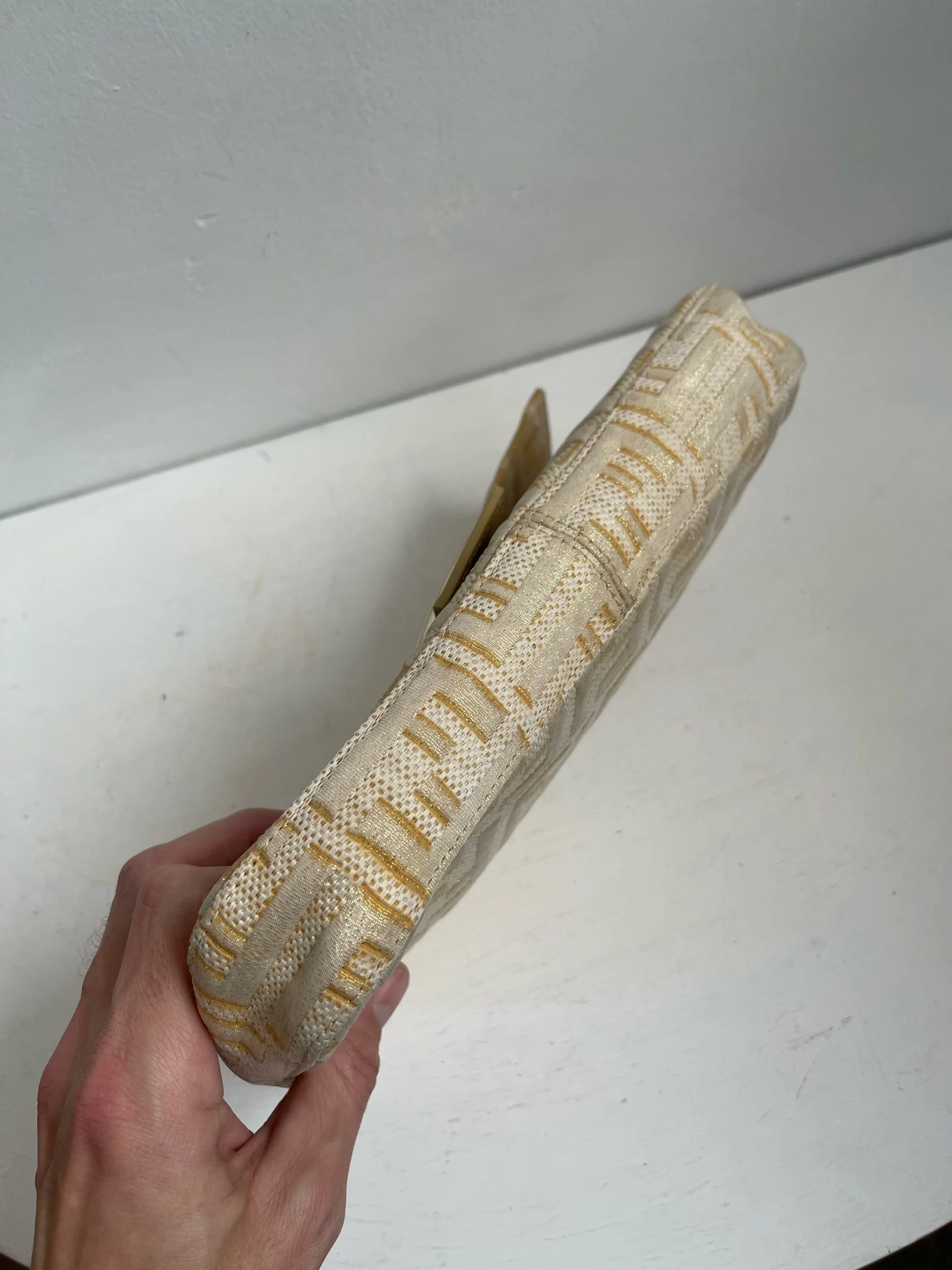 Crafted in beige fabric with the signature Zucca FF monogram, the bag is beautifully accented with metallic gold leather across the front flap and finished with Fendi’s iconic gold FF twist-lock closure. Originally designed to be worn with a detachable strap, this bag’s strap has been lost — however, its sleek silhouette makes it perfect as a clutch, and it has been used and styled as one.