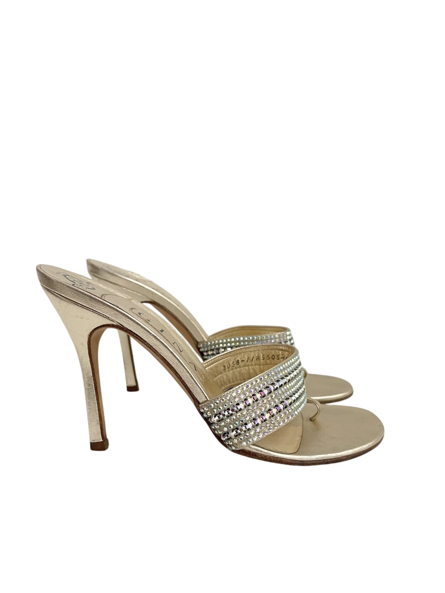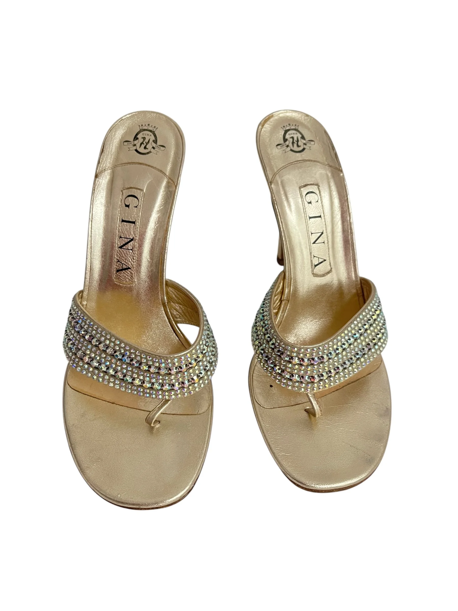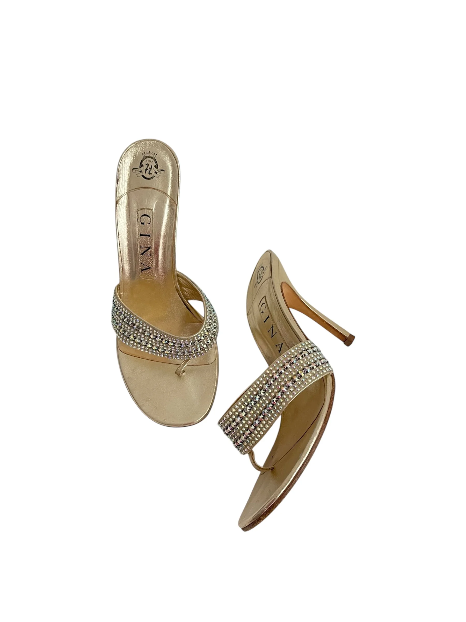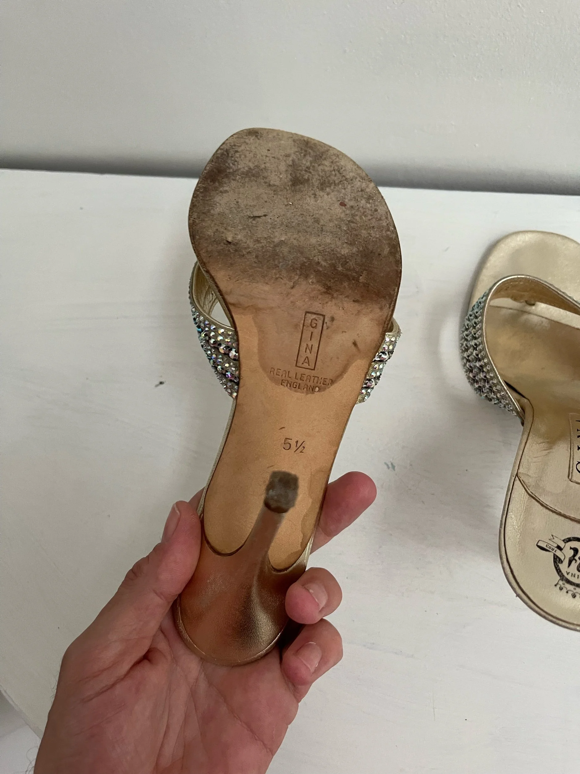 Step into timeless elegance with these Gina of London “Tatiana” heels, a rare vintage design that perfectly balances glamour and sophistication. Crafted in gold leather, they feature the iconic crystal top post detail paired with Gina’s distinctive Fong high-heeled silhouette. A true statement piece for collectors and lovers of luxury footwear.