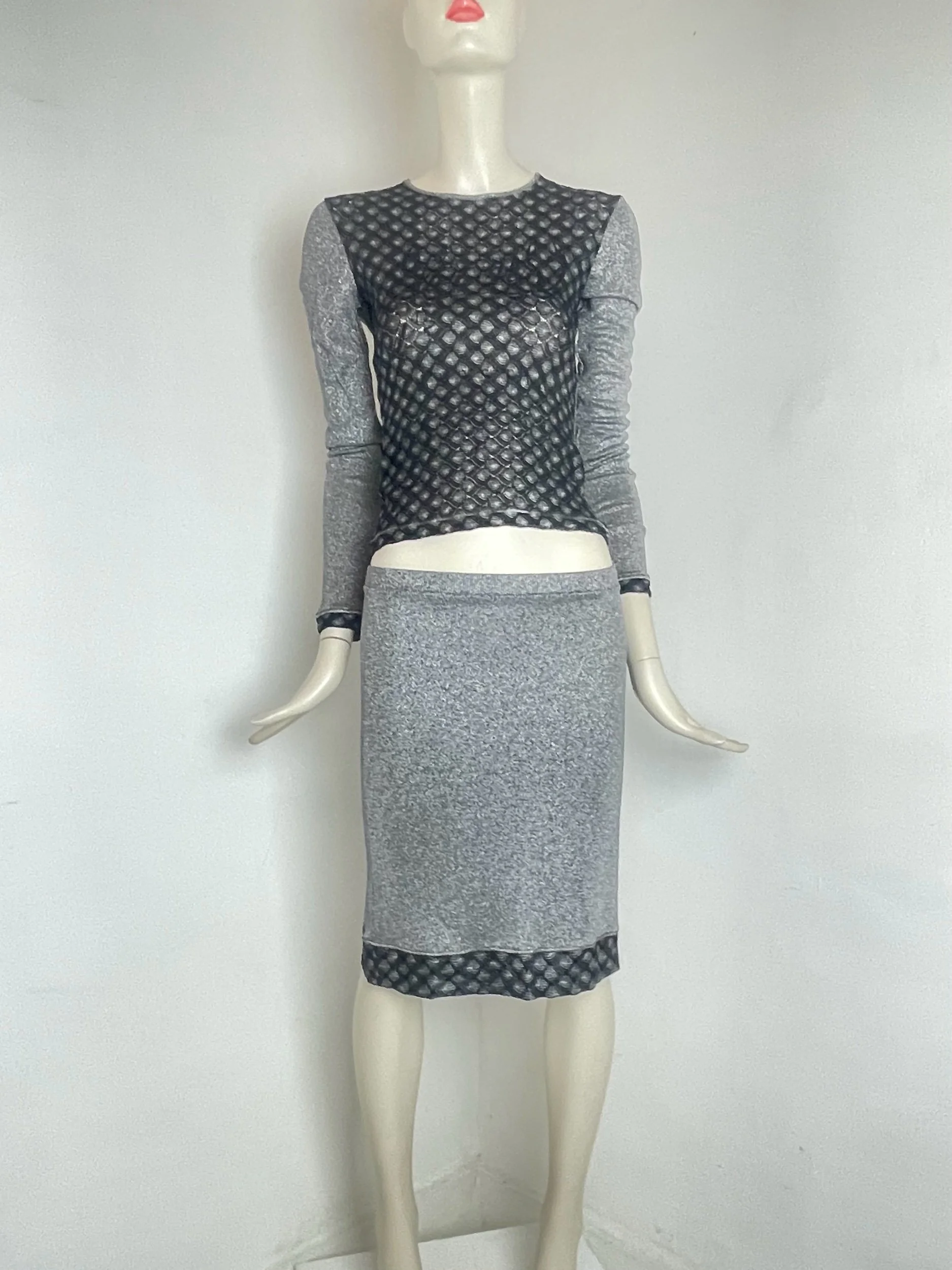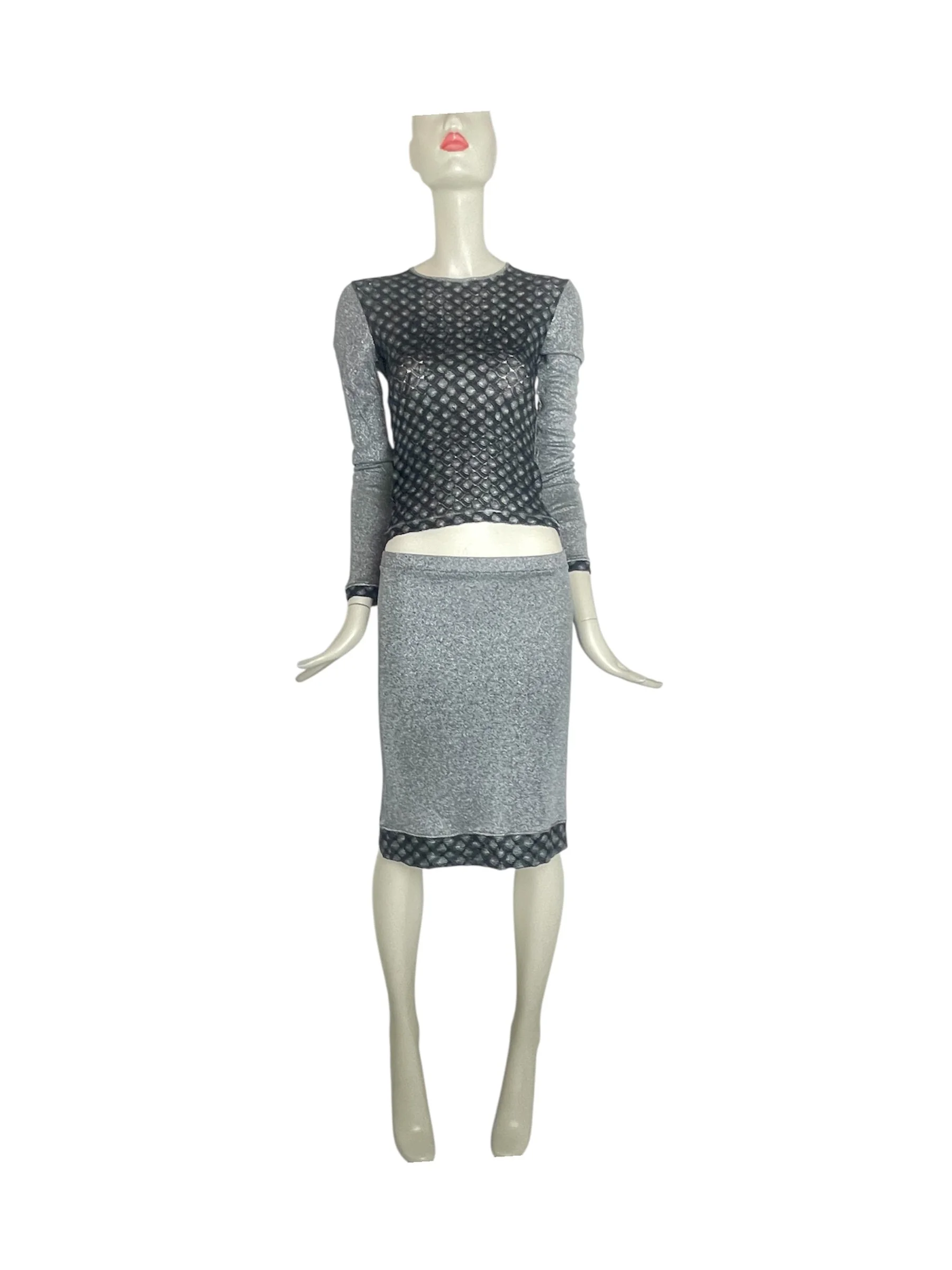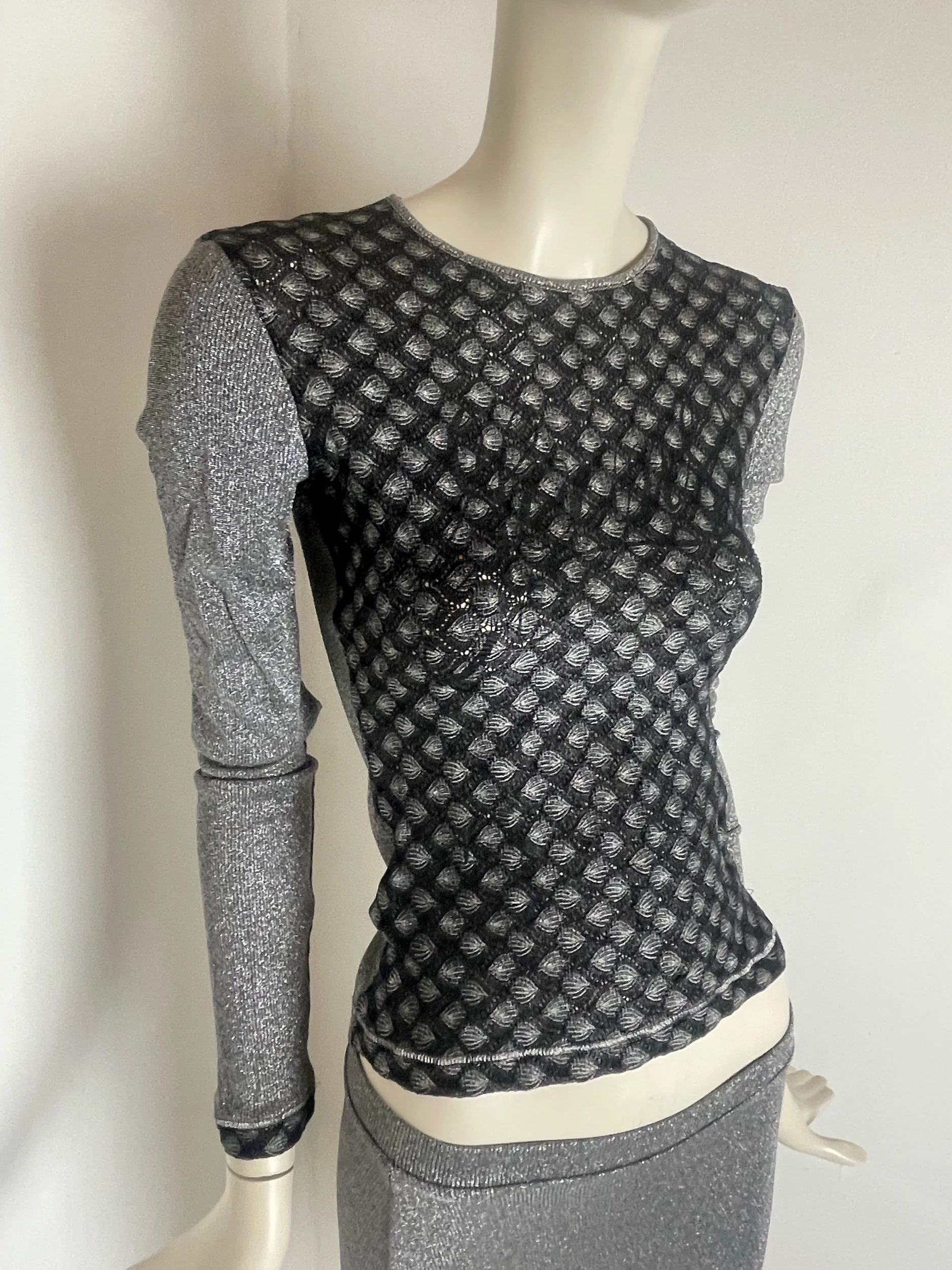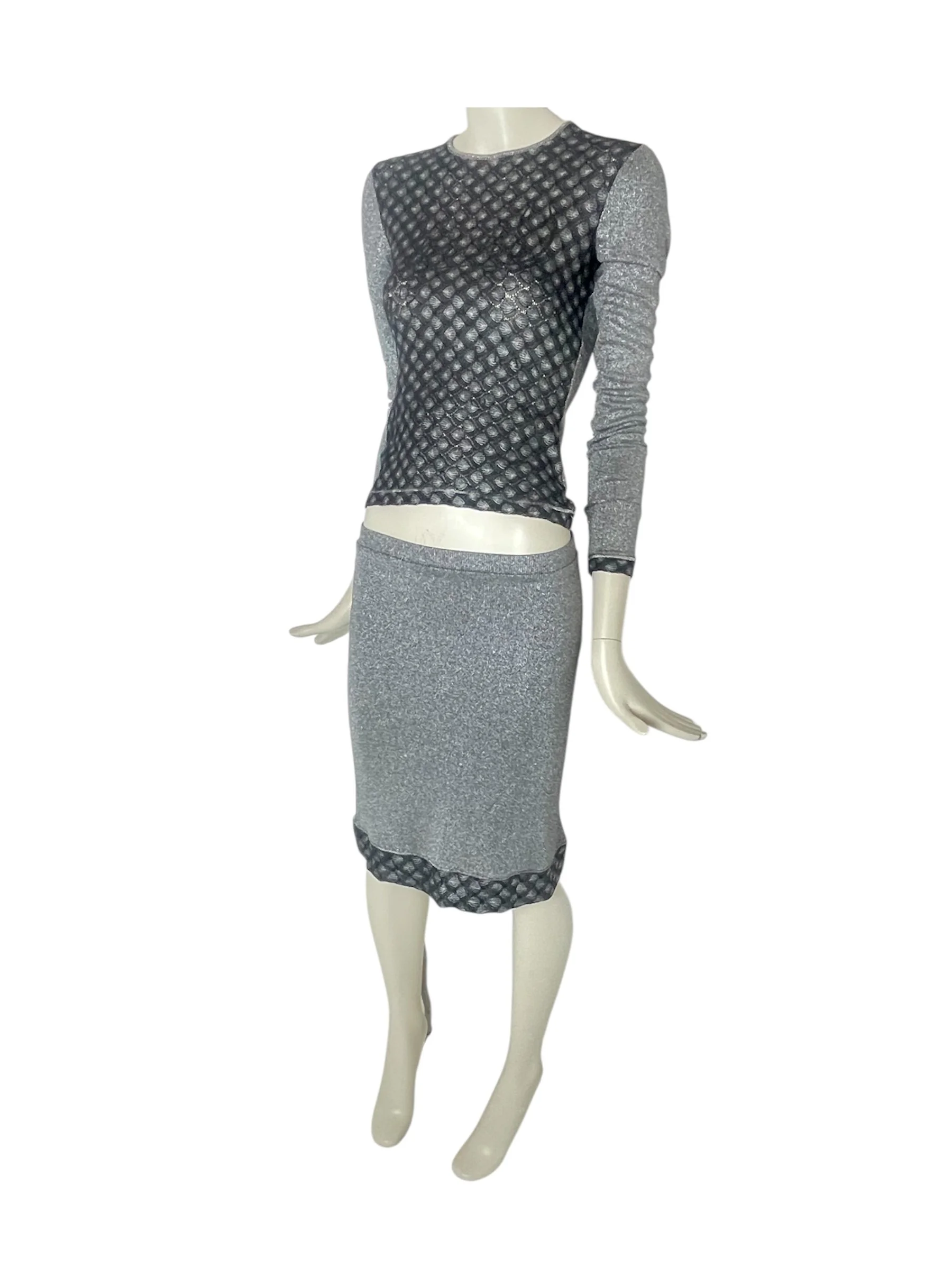A striking vintage two-piece ensemble from Christian Lacroix Jeans, crafted in a shimmering silver lurex knit that gives the set its signature futuristic elegance. The coordinating top and skirt balance texture, shine, and sculpted detailing for a look that is both avant-garde and wearable.