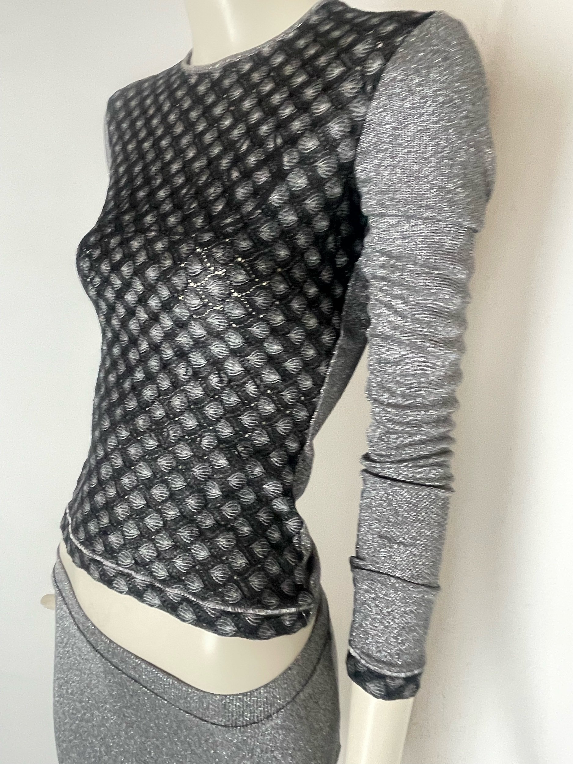The long-sleeved top features a body-hugging silhouette in a semi-sheer lurex knit. The front and sleeve cuffs are overlaid with a dimensional black-and-silver bubble-textured pattern, adding depth and contrast to the metallic base. A classic crew neckline keeps the design clean while the cropped length subtly elongates the waistline.