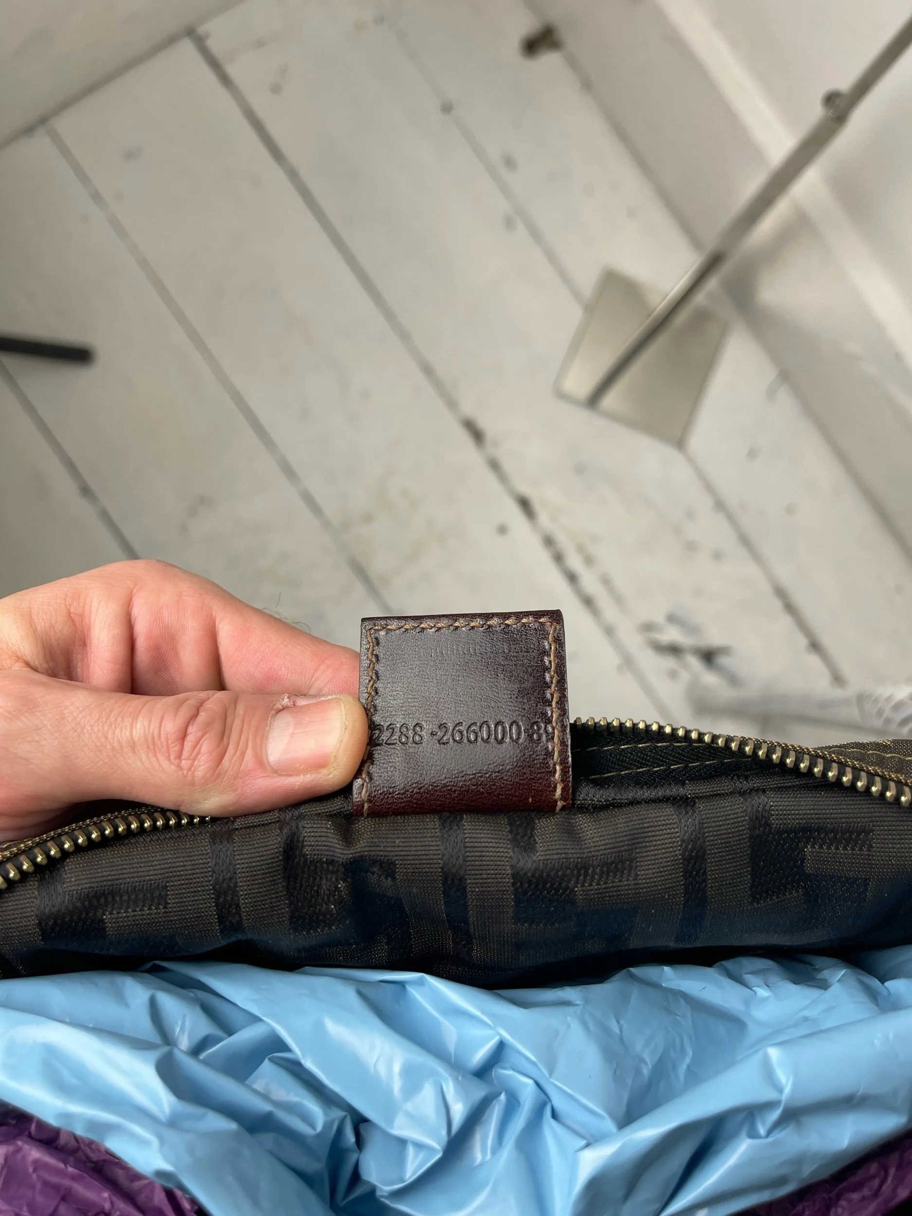 Elevate your collection with this striking vintage Fendi clutch, crafted in the iconic Zucca FF canvas and complemented by rich dark brown leather trim. The structured silhouette features cut-out leather handles for a sleek, modern carry option, while the central top zipper keeps your essentials secure.