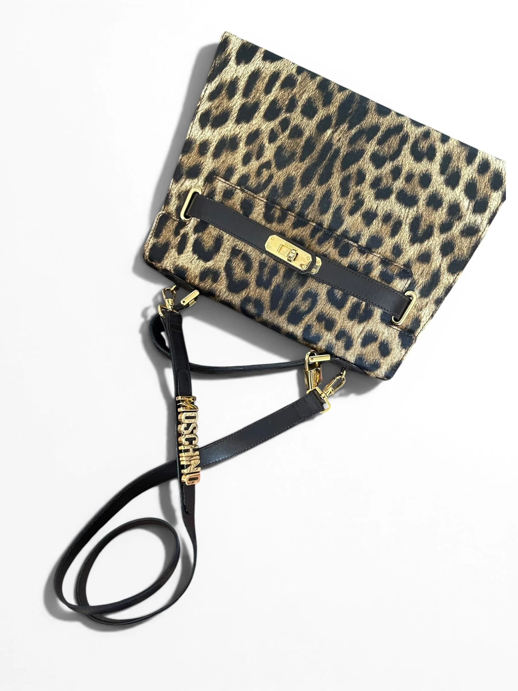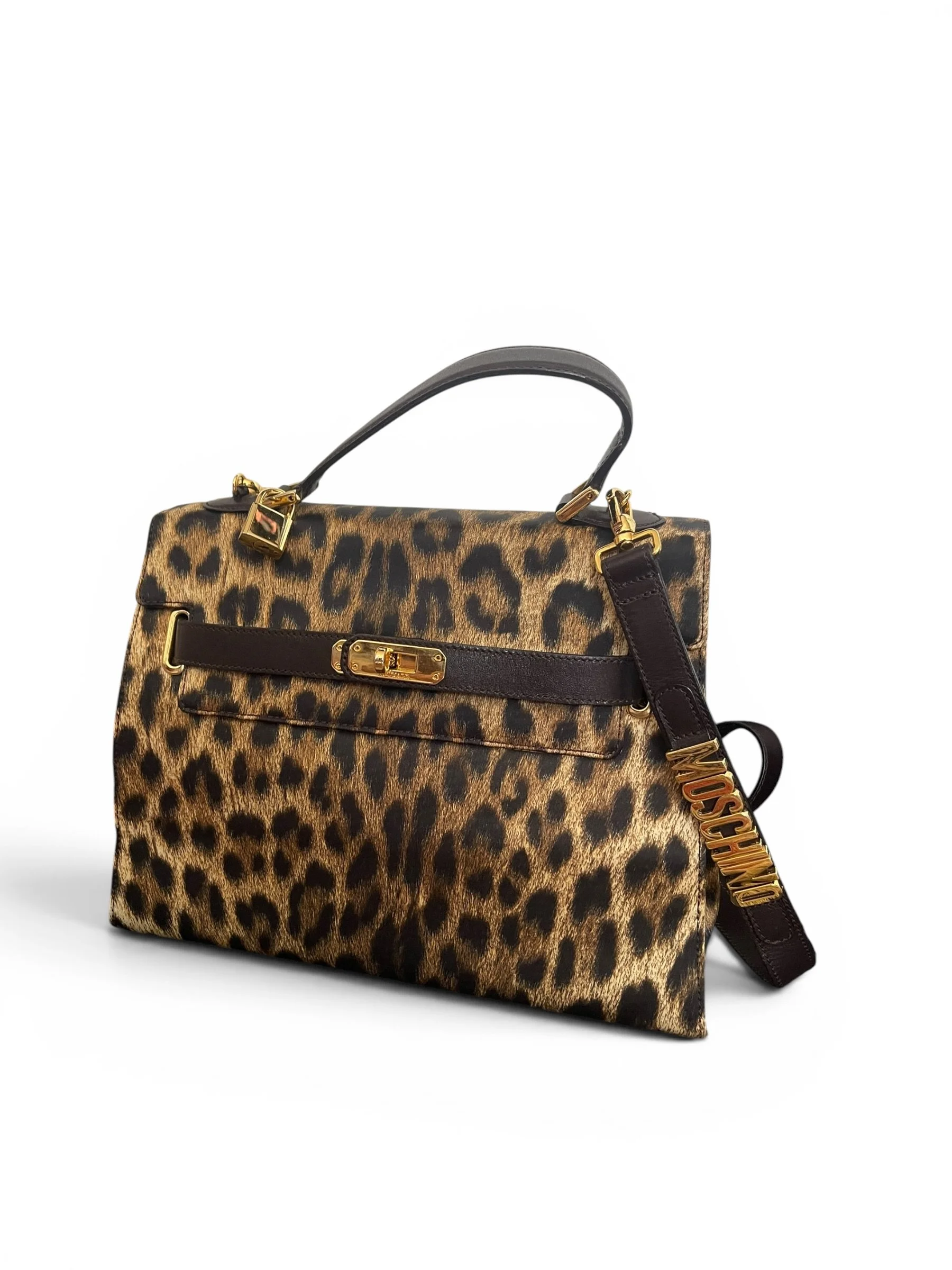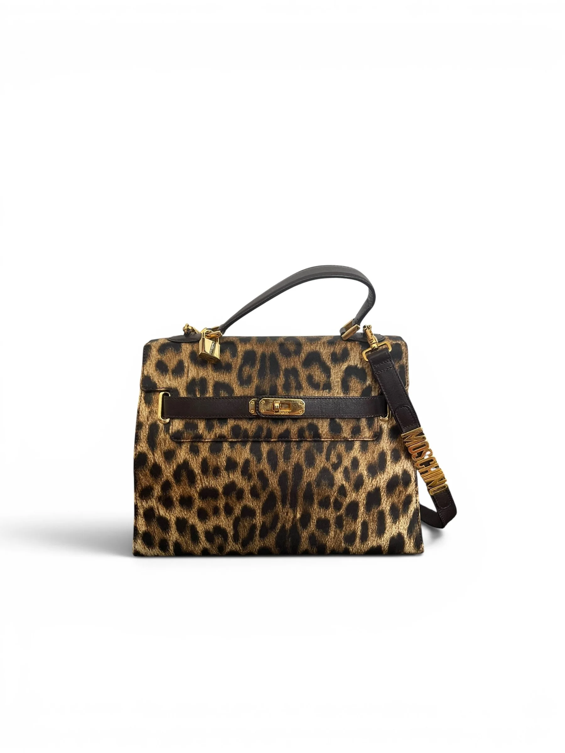 The structured silhouette nods to classic top-handle styles, while the detachable shoulder strap—complete with Moschino’s signature spell-out lettering—adds a distinctive, fashion-forward edge. Finished with branded hardware and refined detailing, this is a true collector’s piece that effortlessly elevates any look.