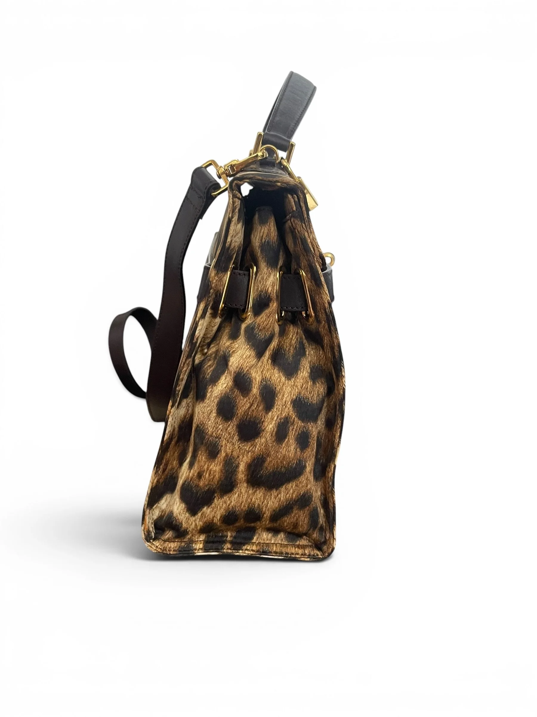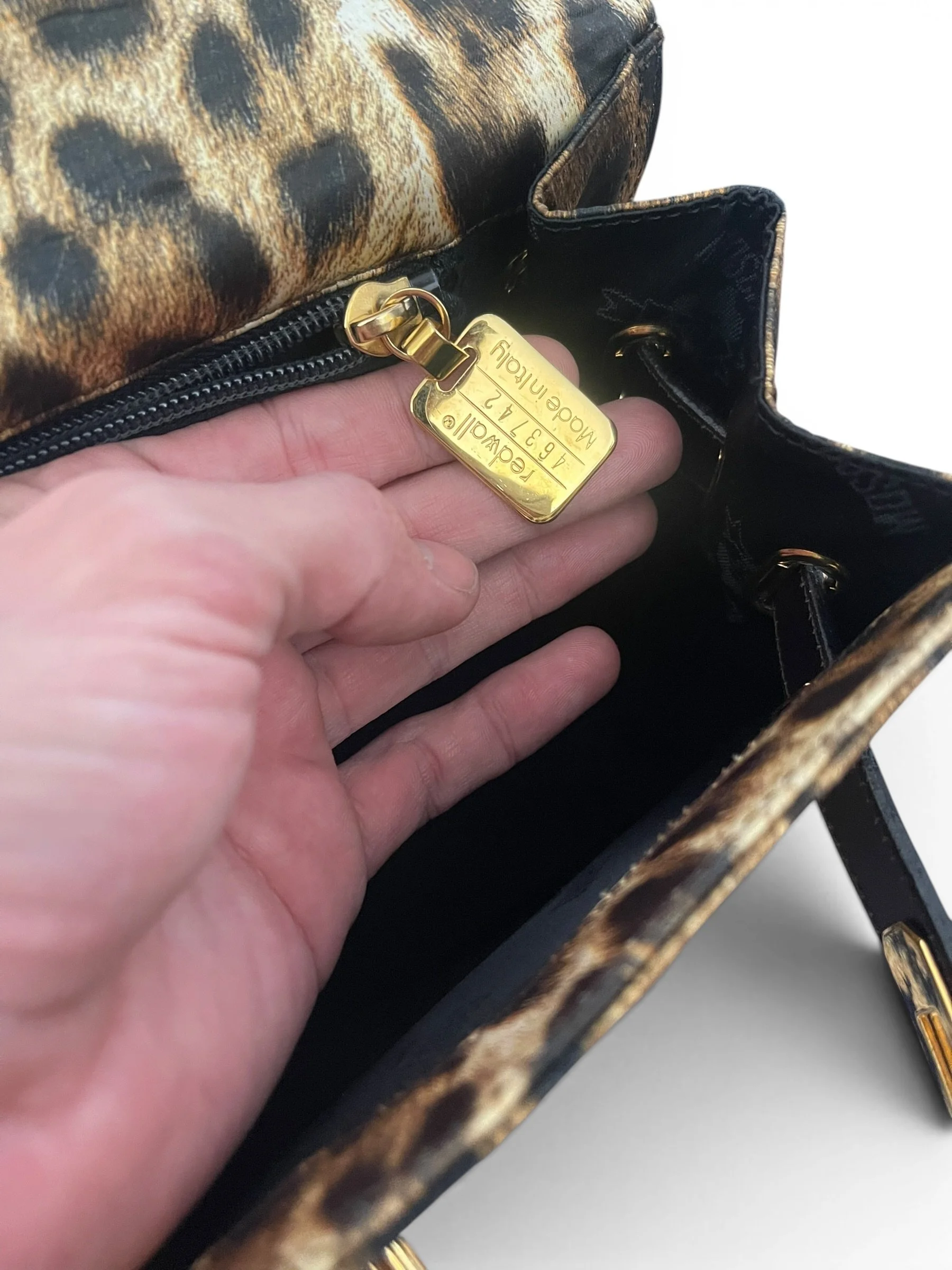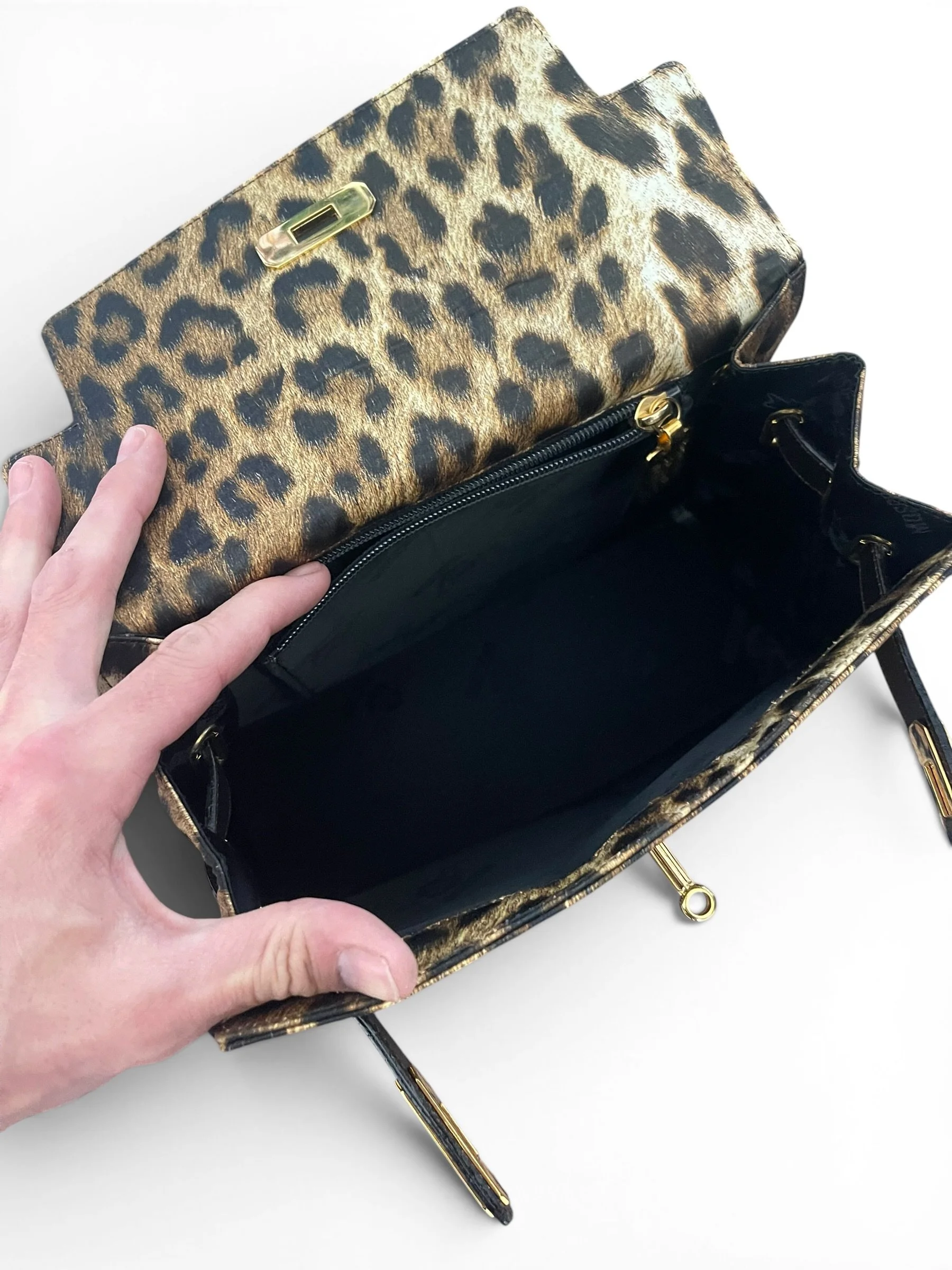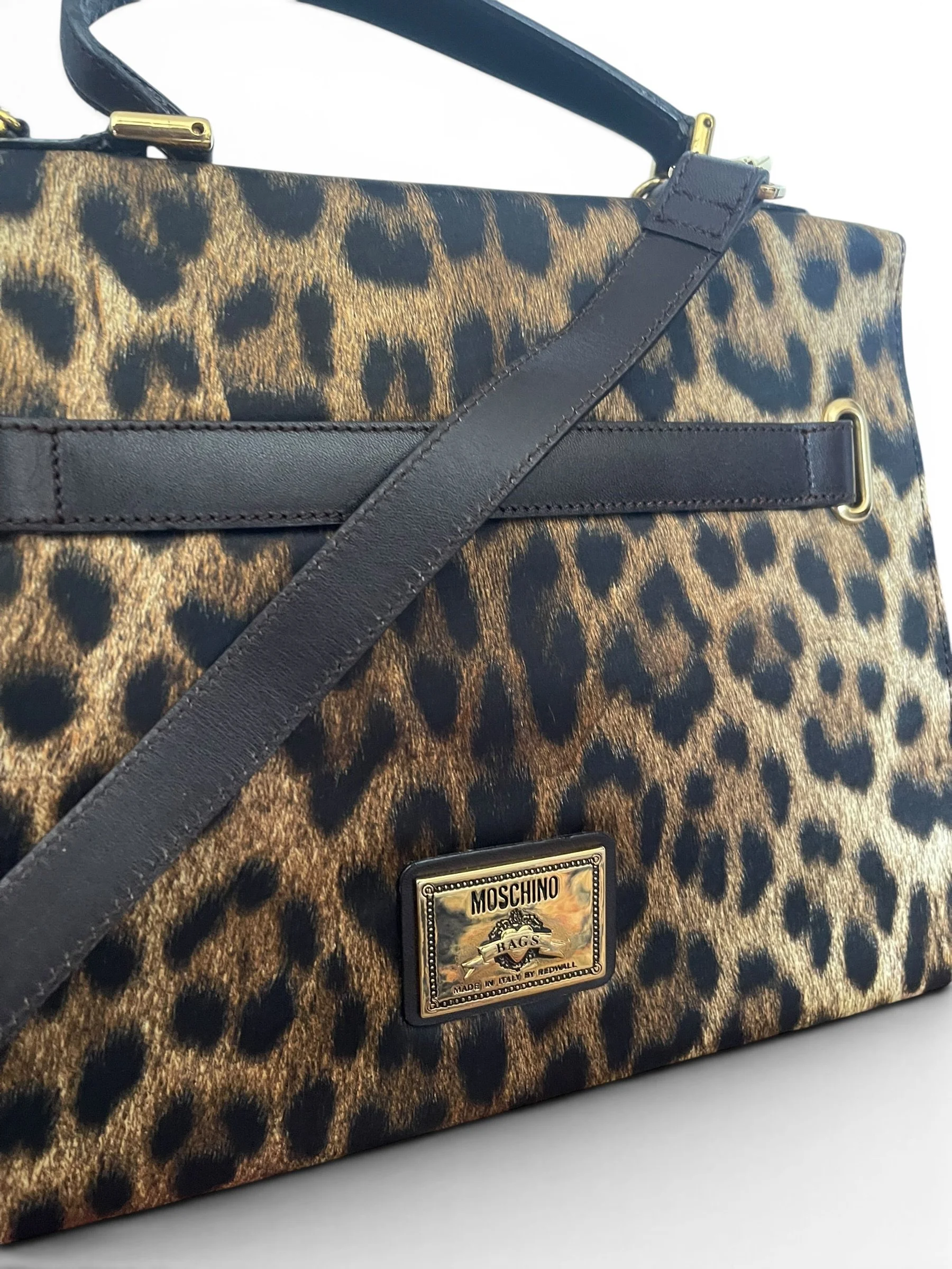 An iconic statement piece from the bold and playful world of Moschino, this vintage “Kelly” bag by Redwall captures the unmistakable spirit of 1990s fashion. Crafted in Italy, it features a striking leopard print satin exterior paired with rich brown leather trim and gold-tone hardware for a glamorous, high-impact finish.