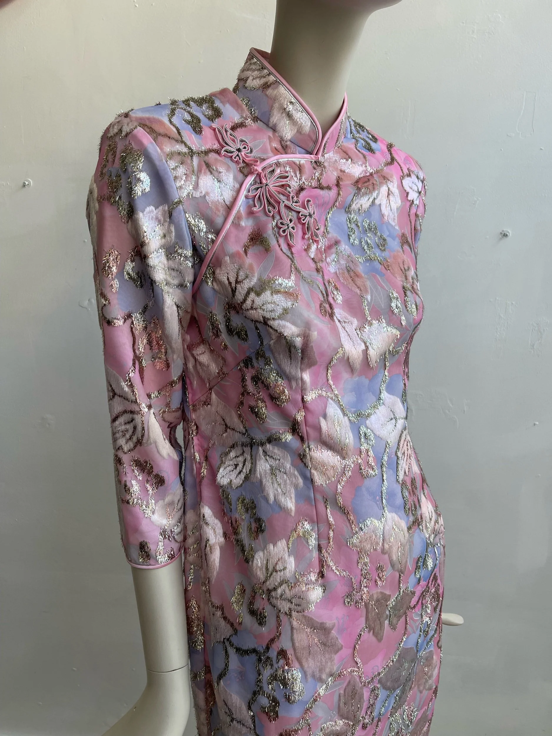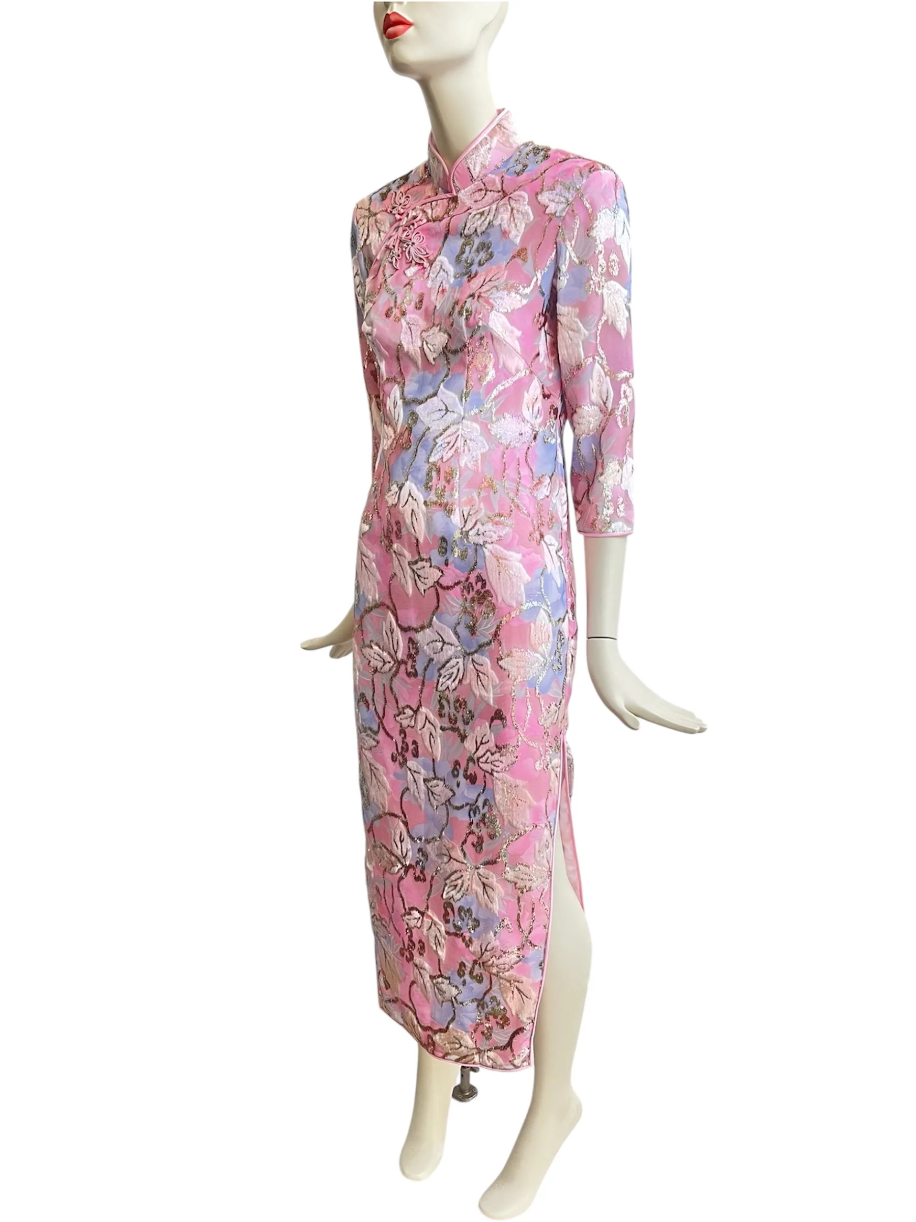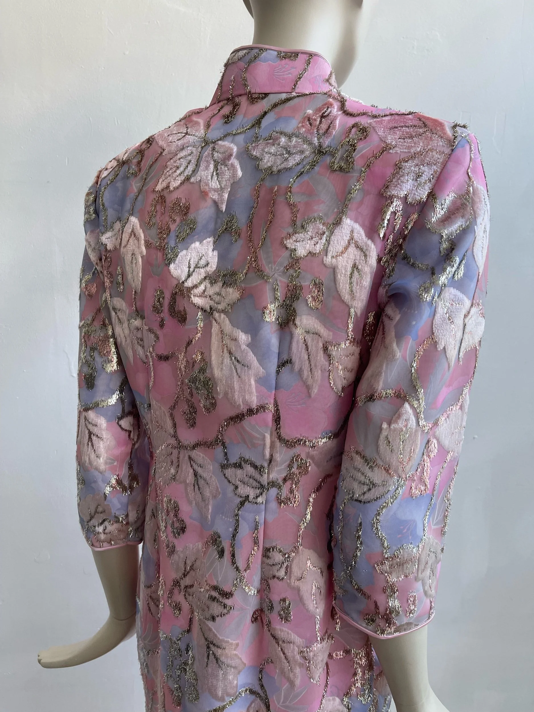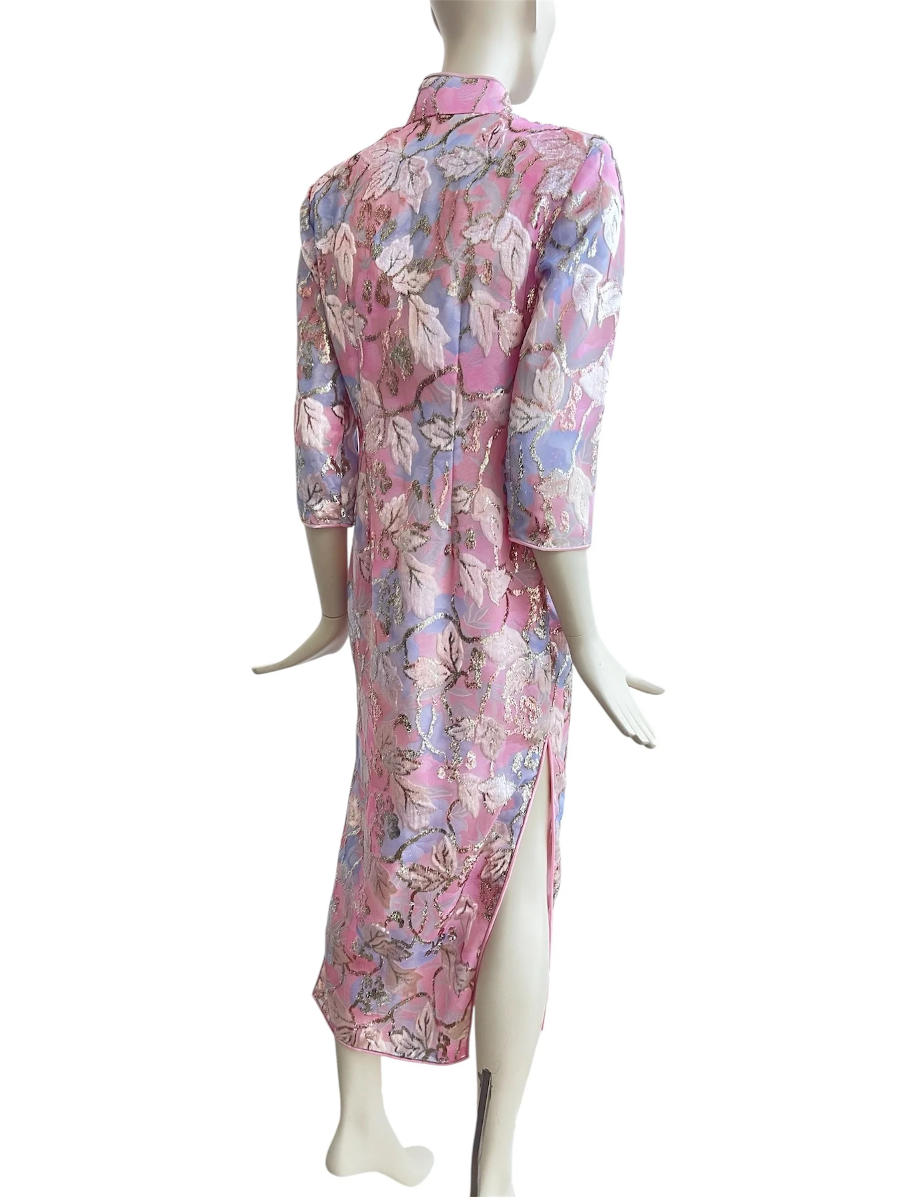 A rare and exquisite find, this original 1960s evening dress embodies timeless elegance with its refined silhouette and intricate detailing. Crafted in a lustrous pink textured fabric, the design is enriched with a woven floral motif in lilac, ivory, and soft metallic tones, creating a subtle shimmer under light. The dress is tailored with a high mandarin collar, three-quarter sleeves, and a long, straight skirt with side slits, offering both sophistication and movement.