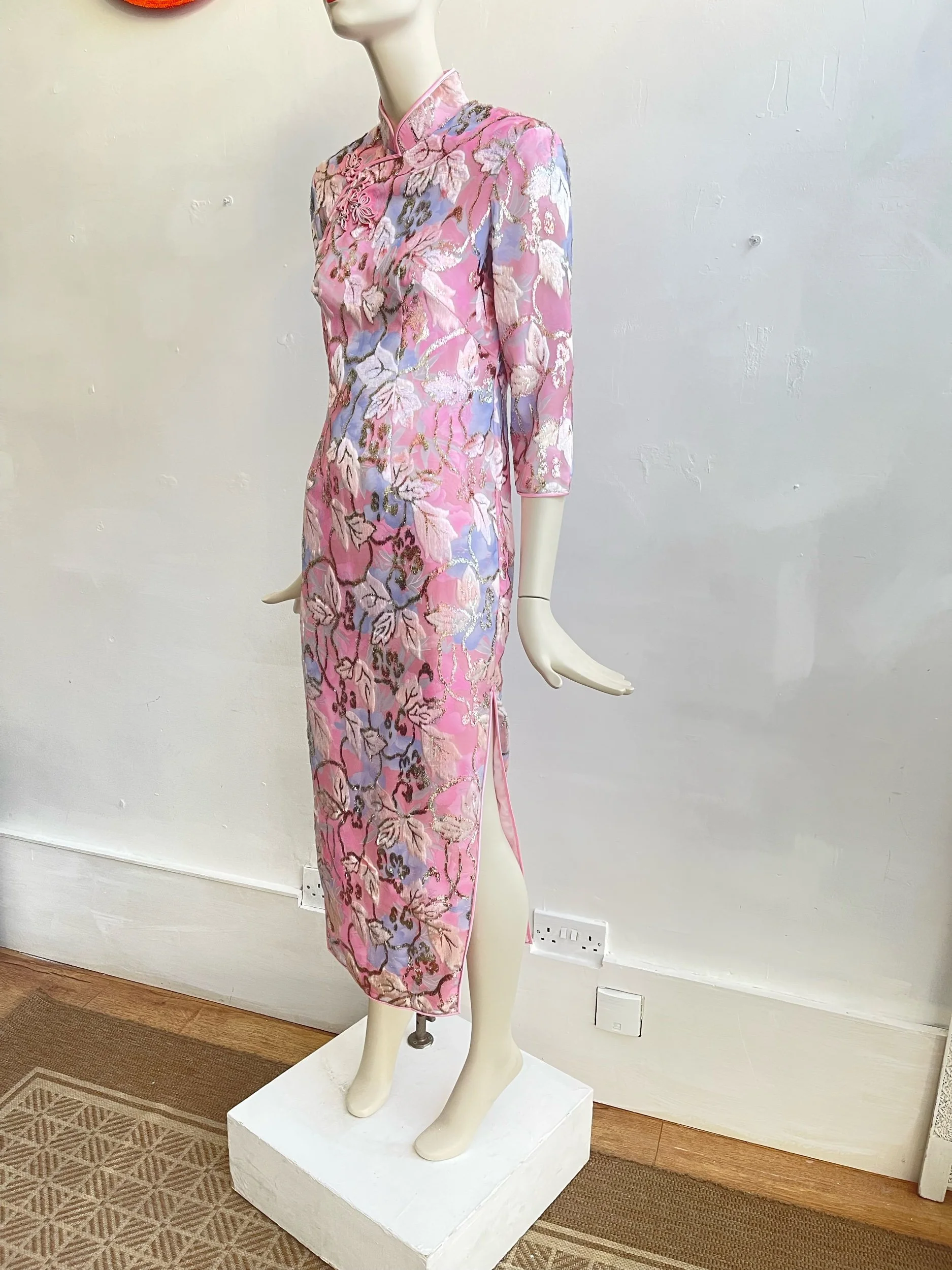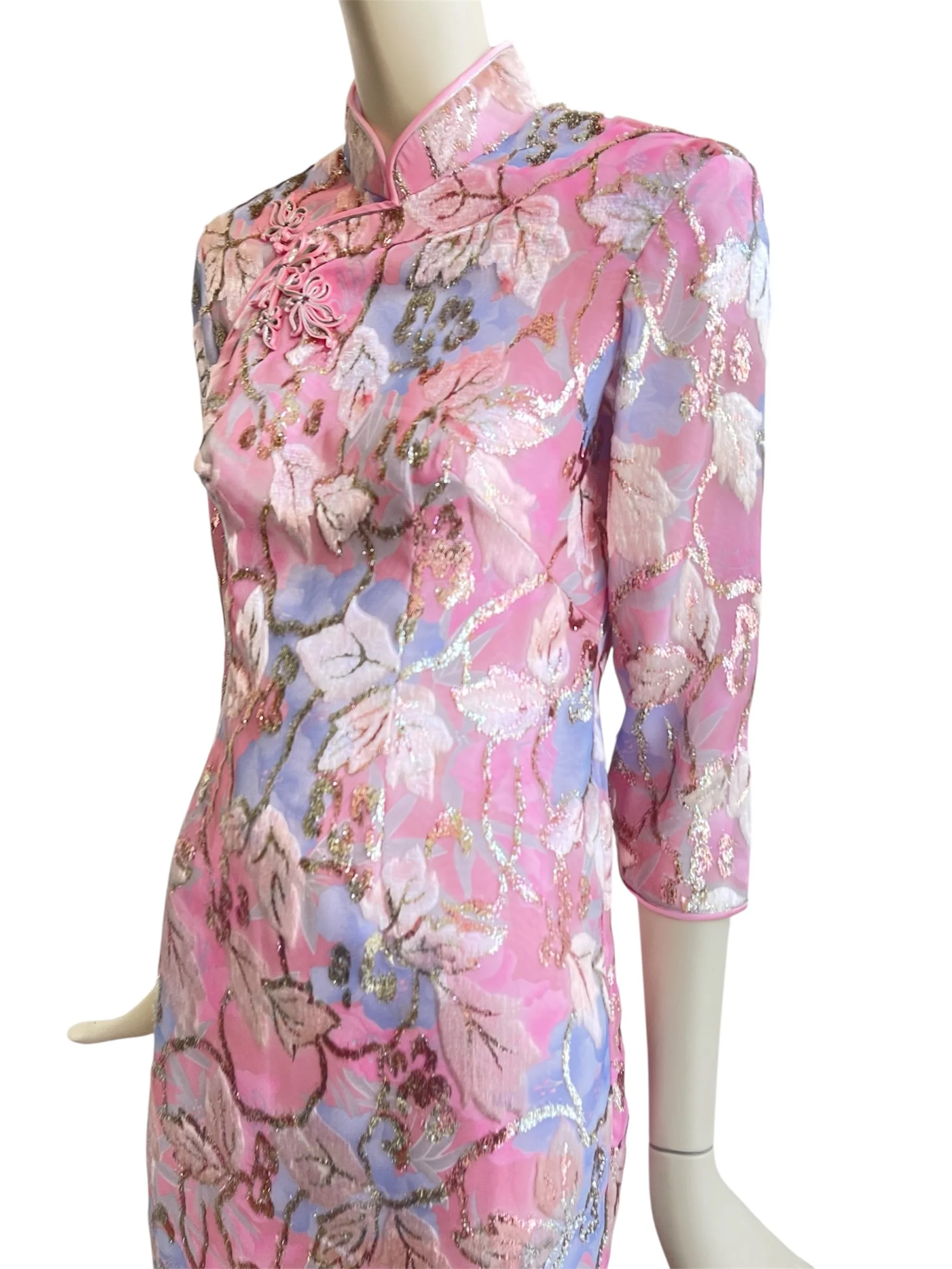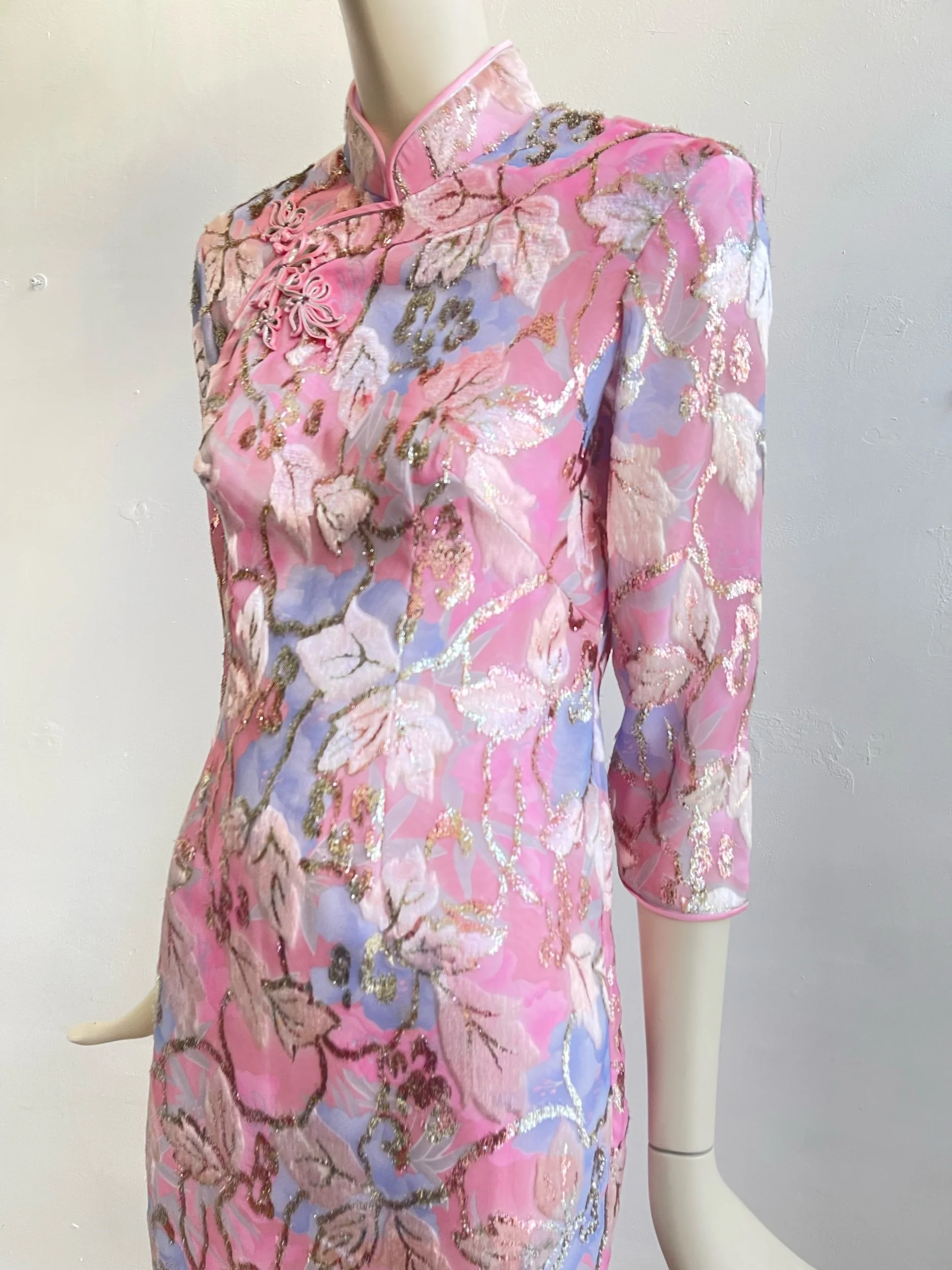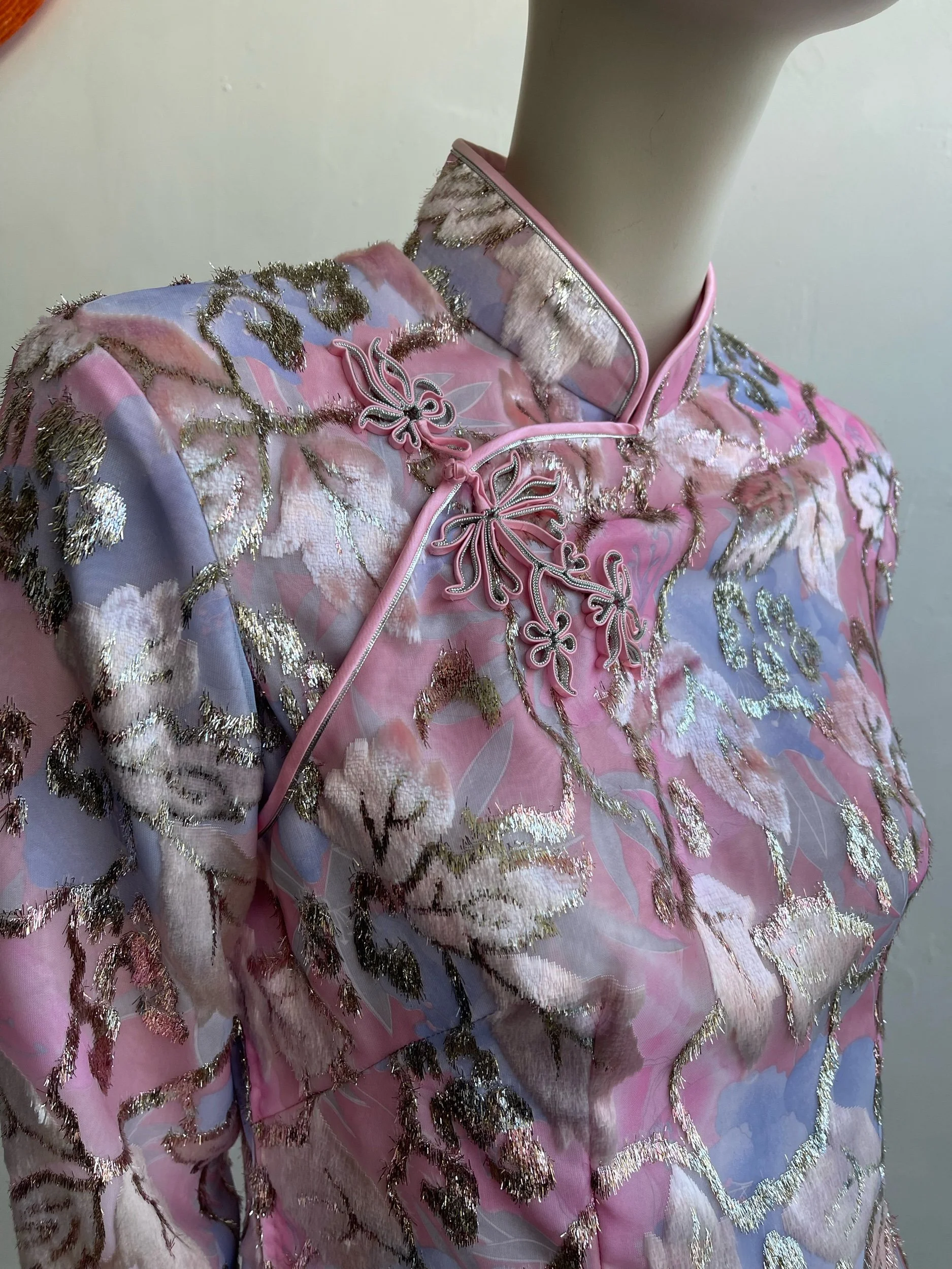 A rare and exquisite find, this original 1960s evening dress embodies timeless elegance with its refined silhouette and intricate detailing. Crafted in a lustrous pink textured fabric, the design is enriched with a woven floral motif in lilac, ivory, and soft metallic tones, creating a subtle shimmer under light. The dress is tailored with a high mandarin collar, three-quarter sleeves, and a long, straight skirt with side slits, offering both sophistication and movement.