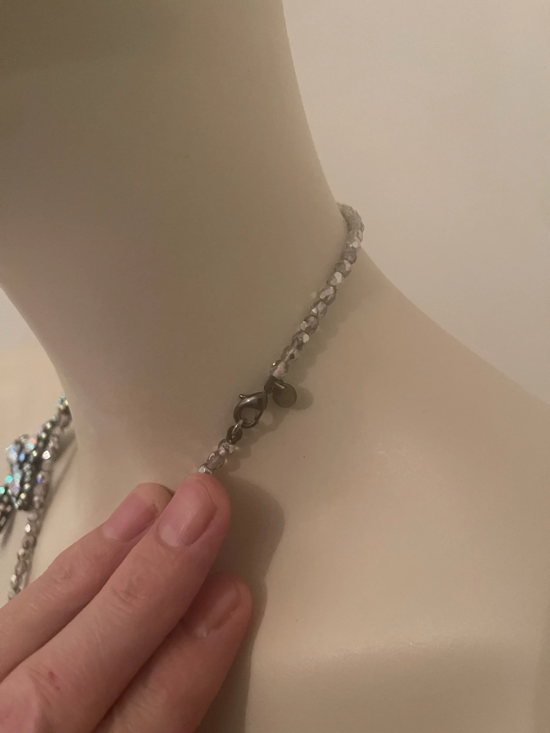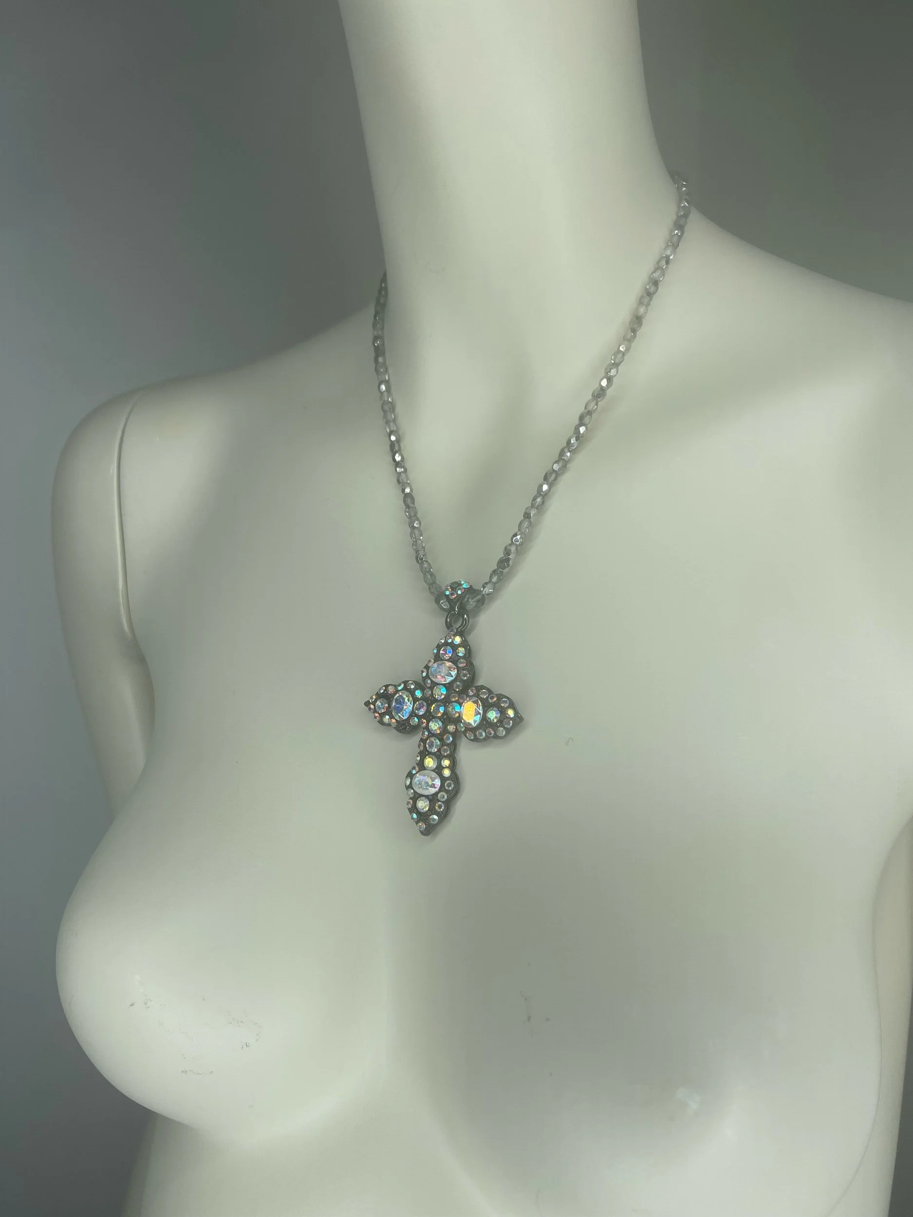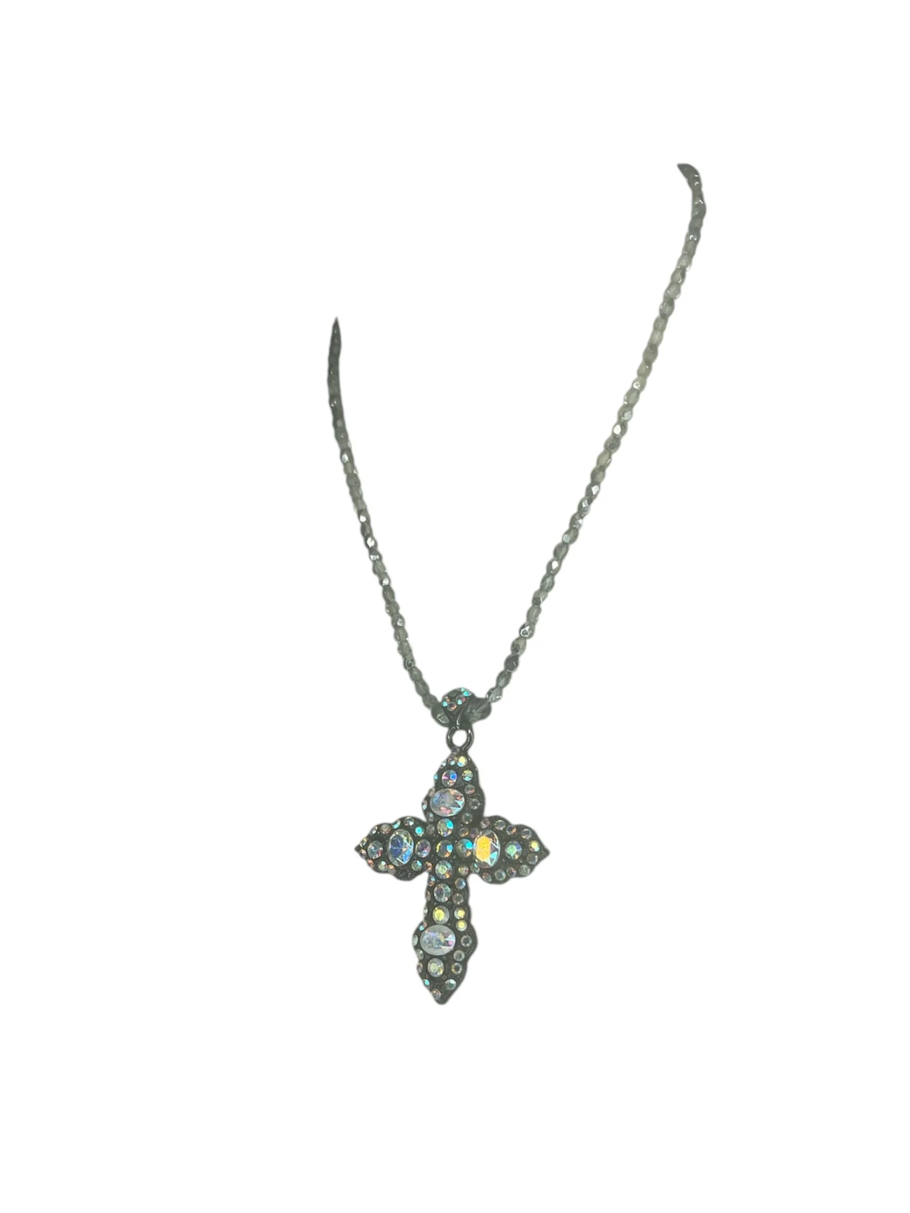 This striking piece features a beautifully detailed cross pendant adorned with shimmering white rhinestones, suspended from a coordinating rhinestone chain. The necklace reflects light beautifully, adding a touch of vintage luxury to any look.