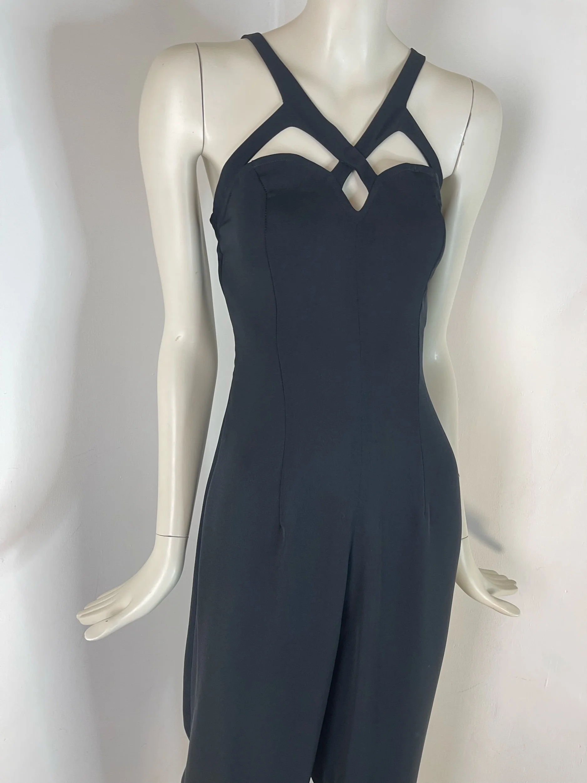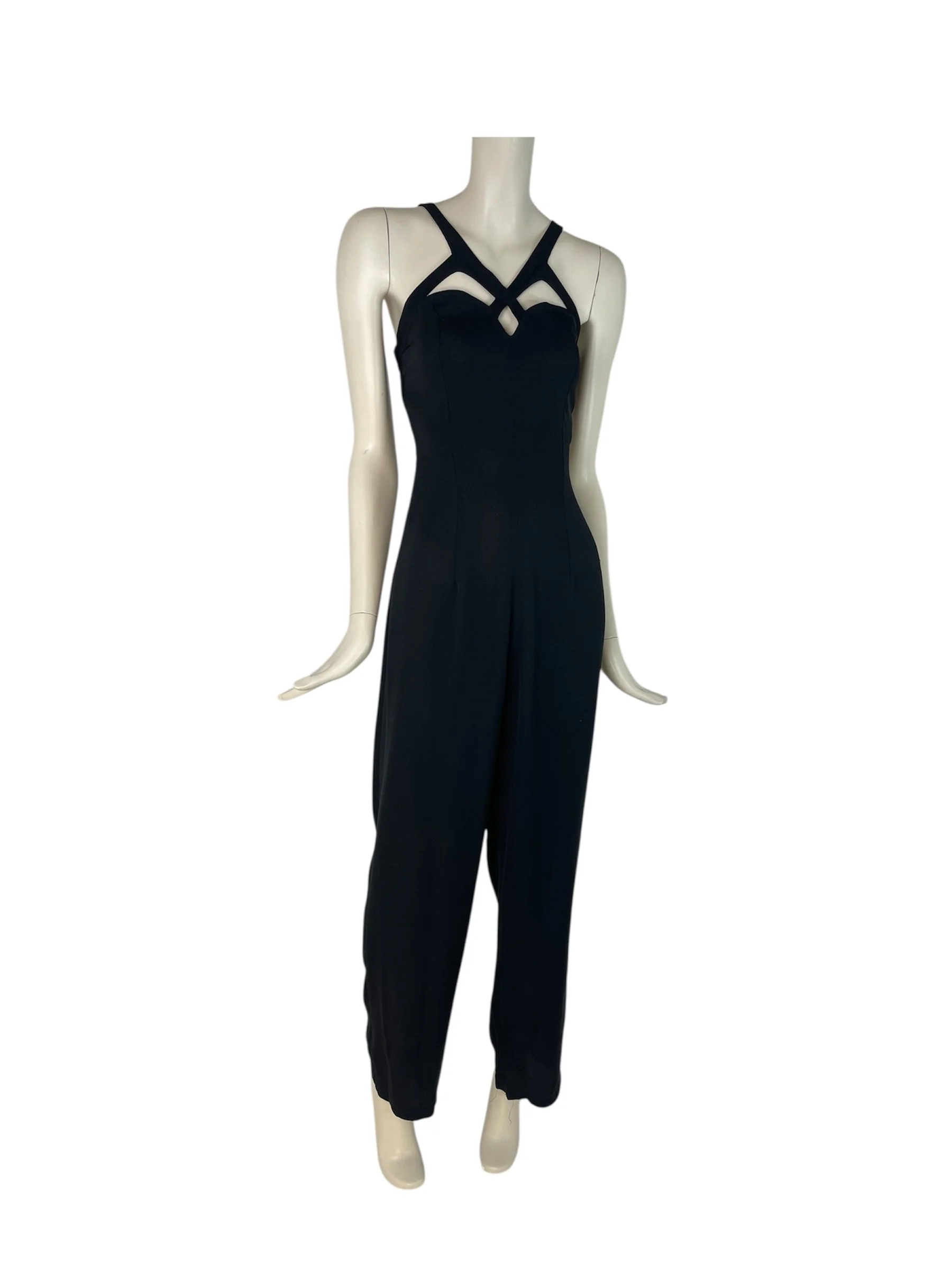 Elevate your wardrobe with this stunning vintage Bernshaw jumpsuit, designed in a timeless black for a sleek, sophisticated look. The standout feature is its beautifully structured strappy neckline with chic cut-out detailing, giving the piece a bold yet elegant edge.