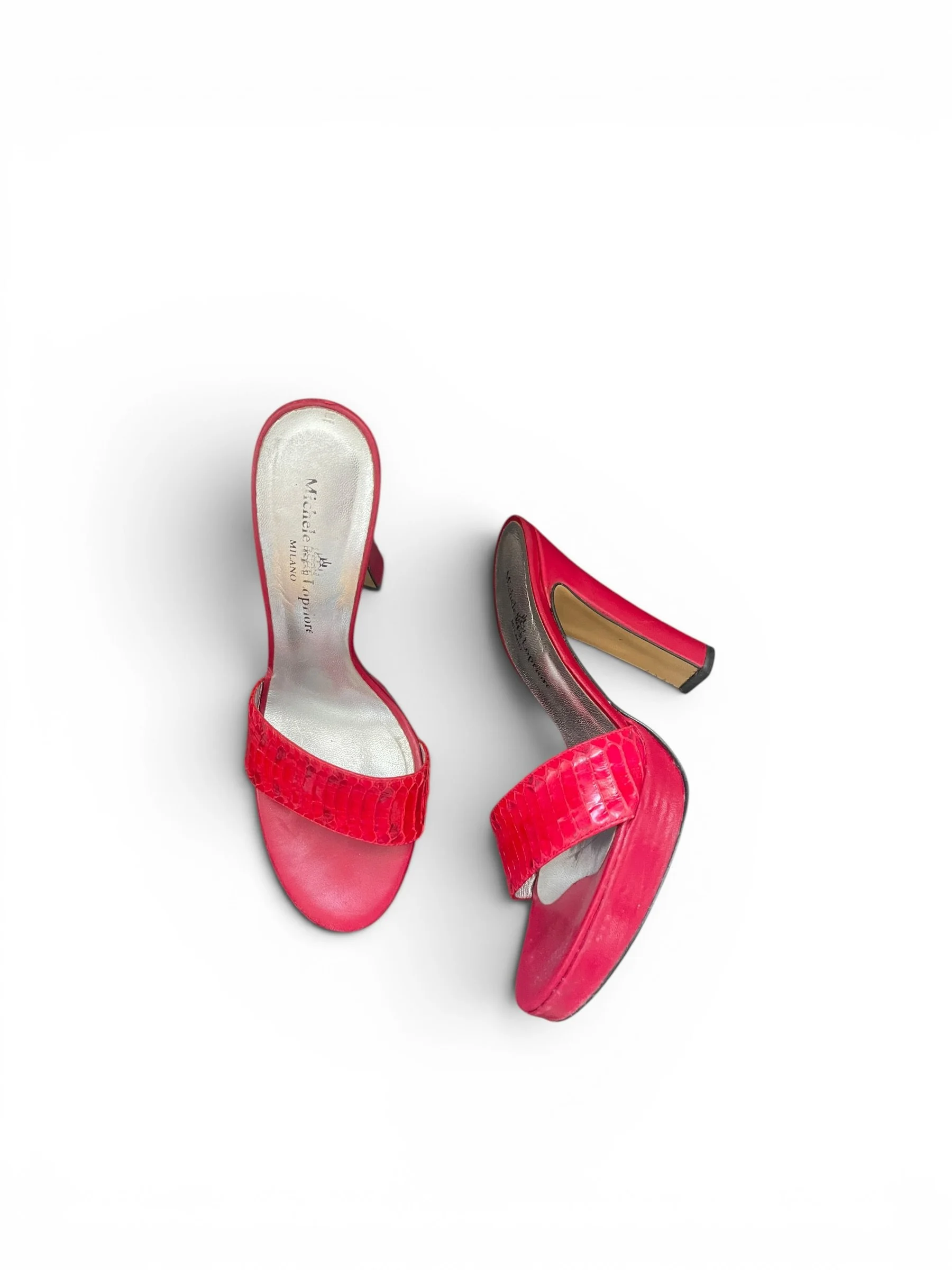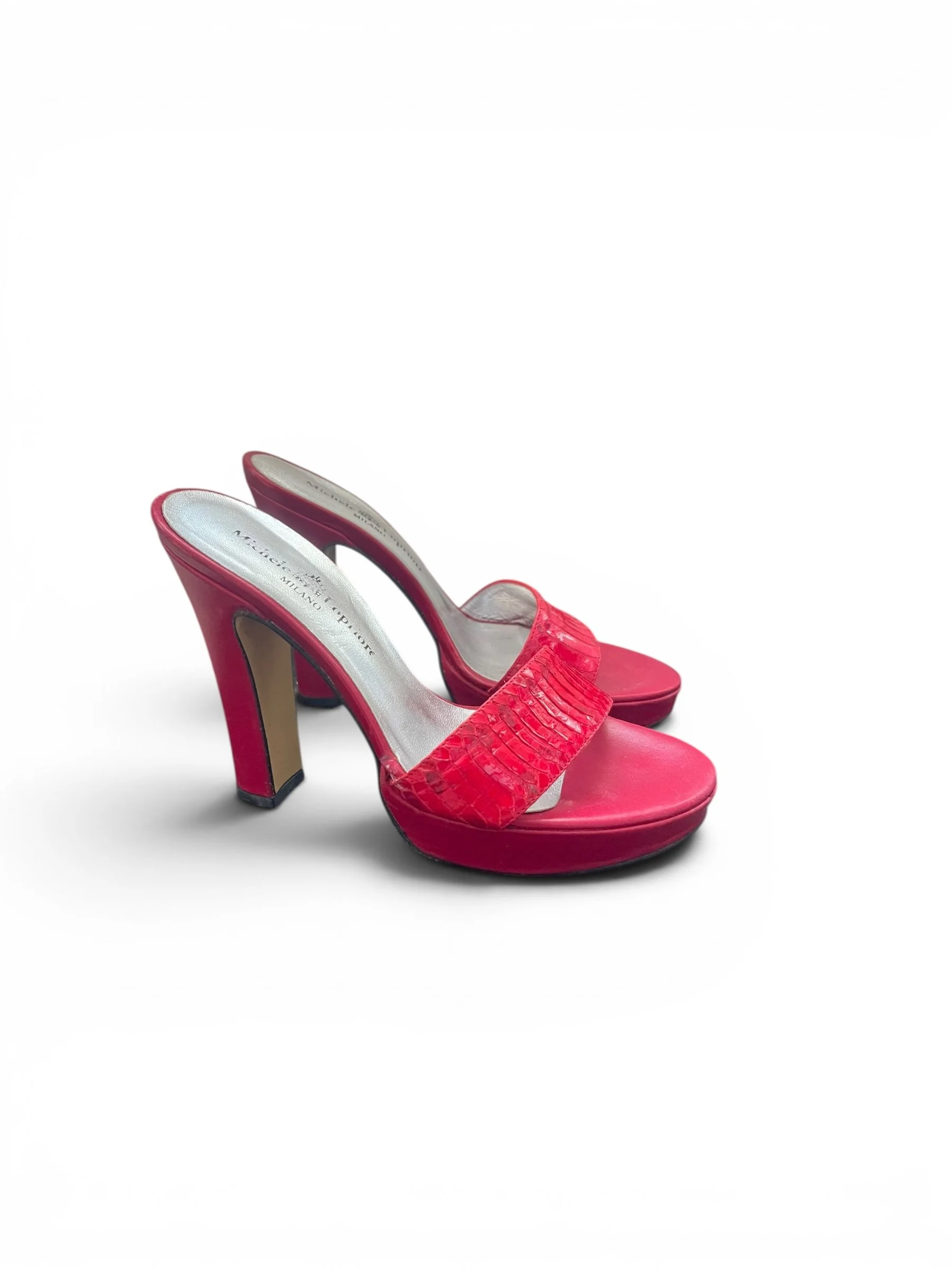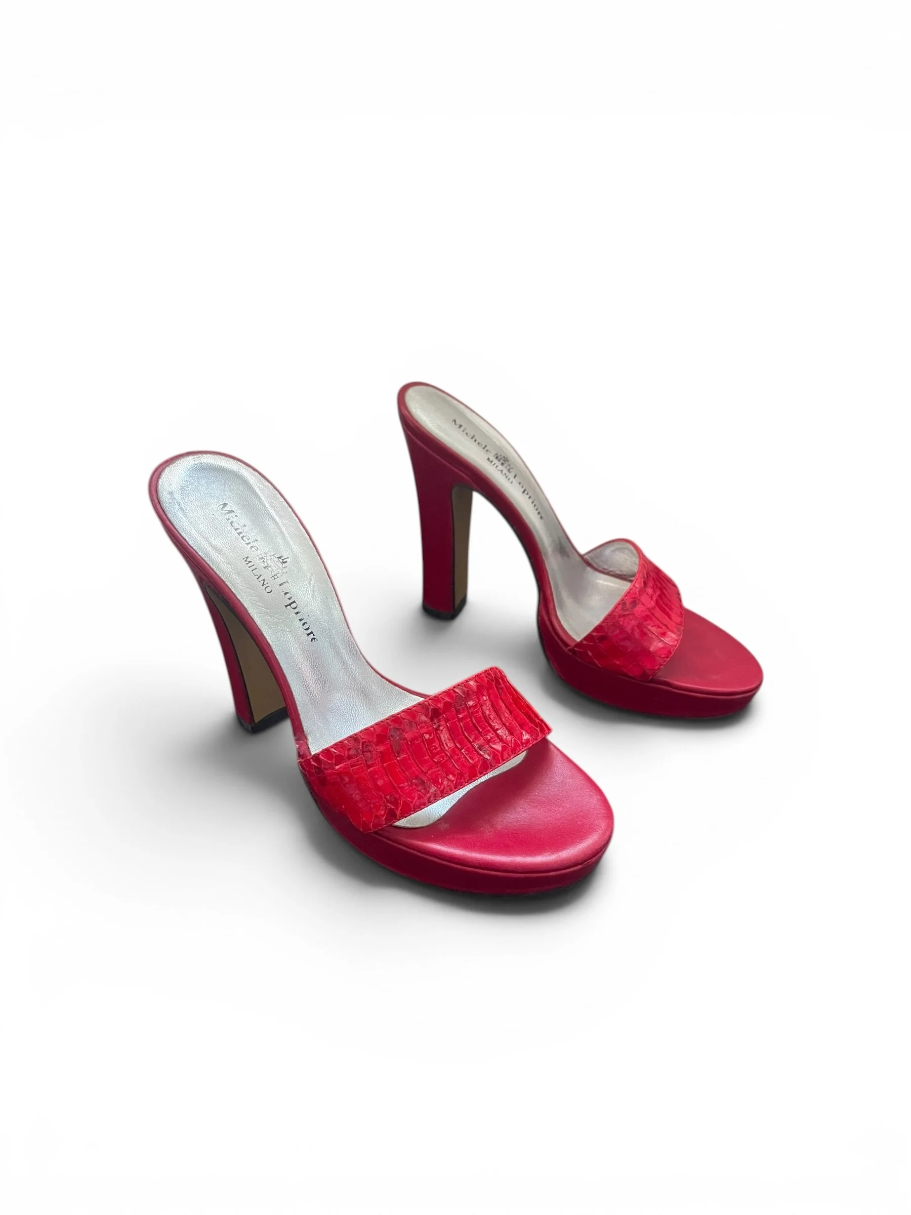 Vintage Italian designer mule sandals by Michele Lopriore Milano in rich red leather with genuine snakeskin-textured front strap. Features a platform sole, sculpted high heels, and classic Y2K silhouette. Made in Italy with leather soles (Vero Cuoio). Good pre-owned condition with light wear consistent with age.