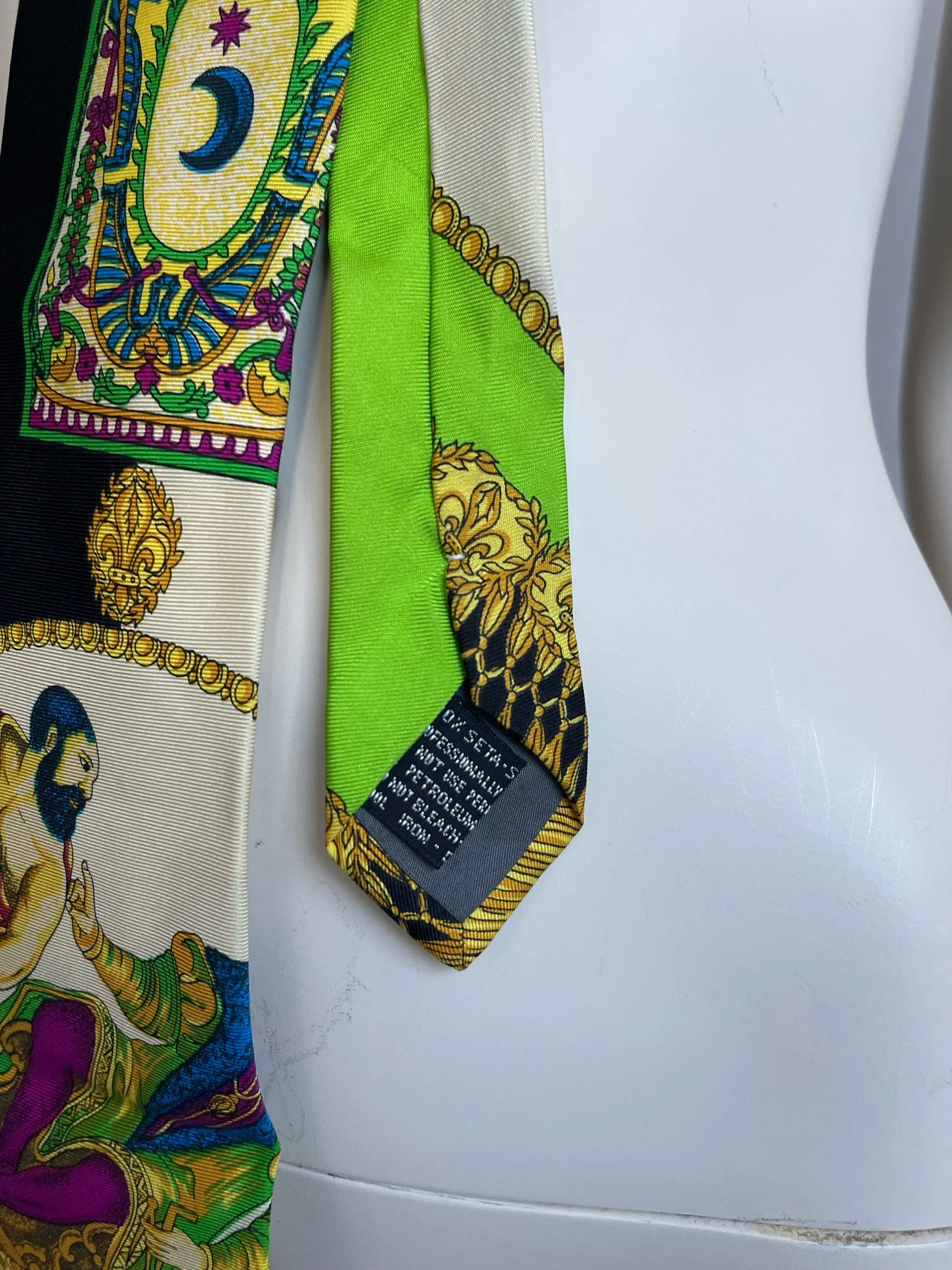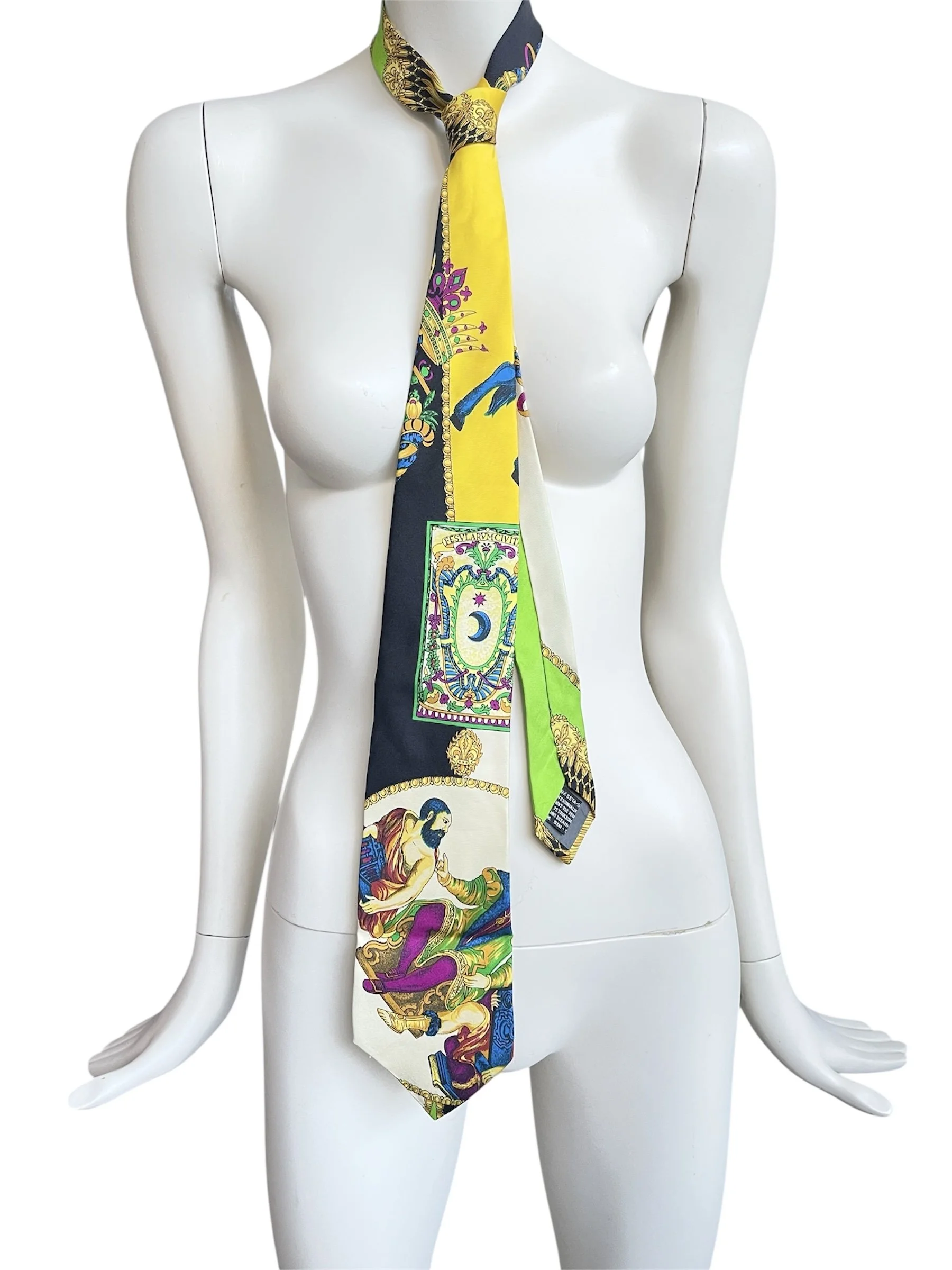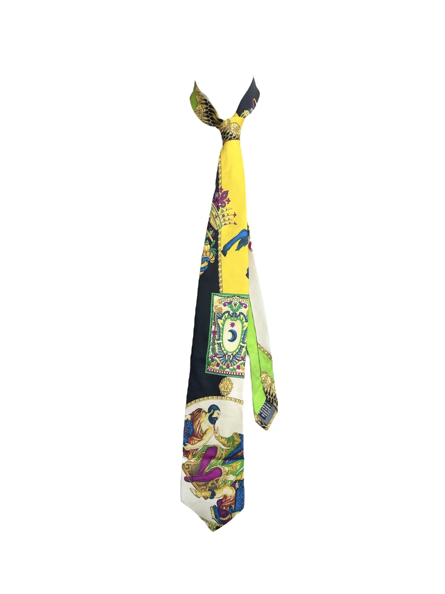 A striking Instante by Gianni Versace silk tie from the 1990s, showcasing an elaborate mythological and celestial design in vivid Versace colors — yellow, navy, emerald, fuchsia, and ivory. This rare vintage piece embodies the bold artistic flair and luxury craftsmanship that defined Versace’s early collections.
