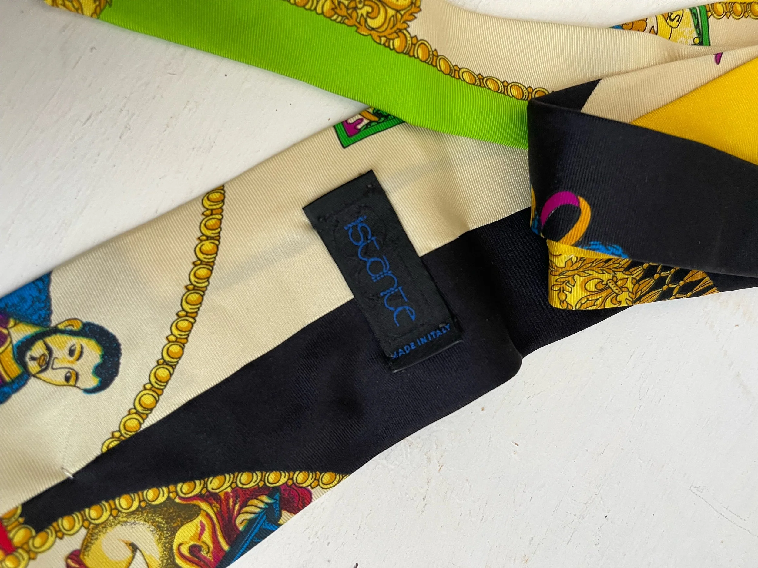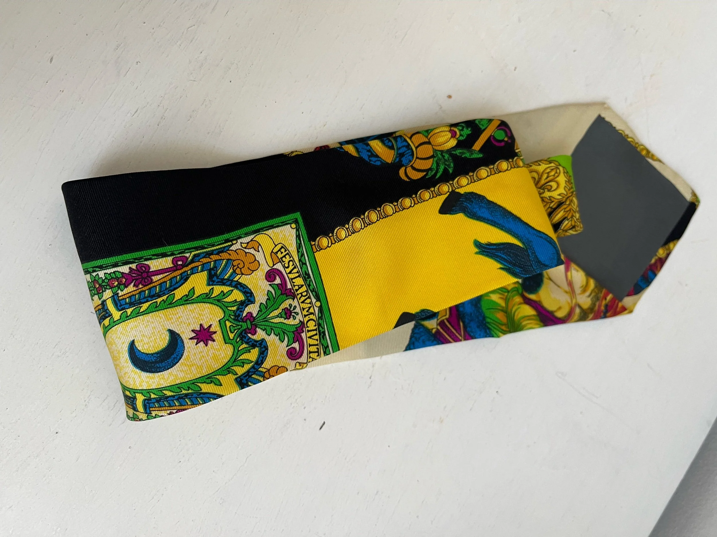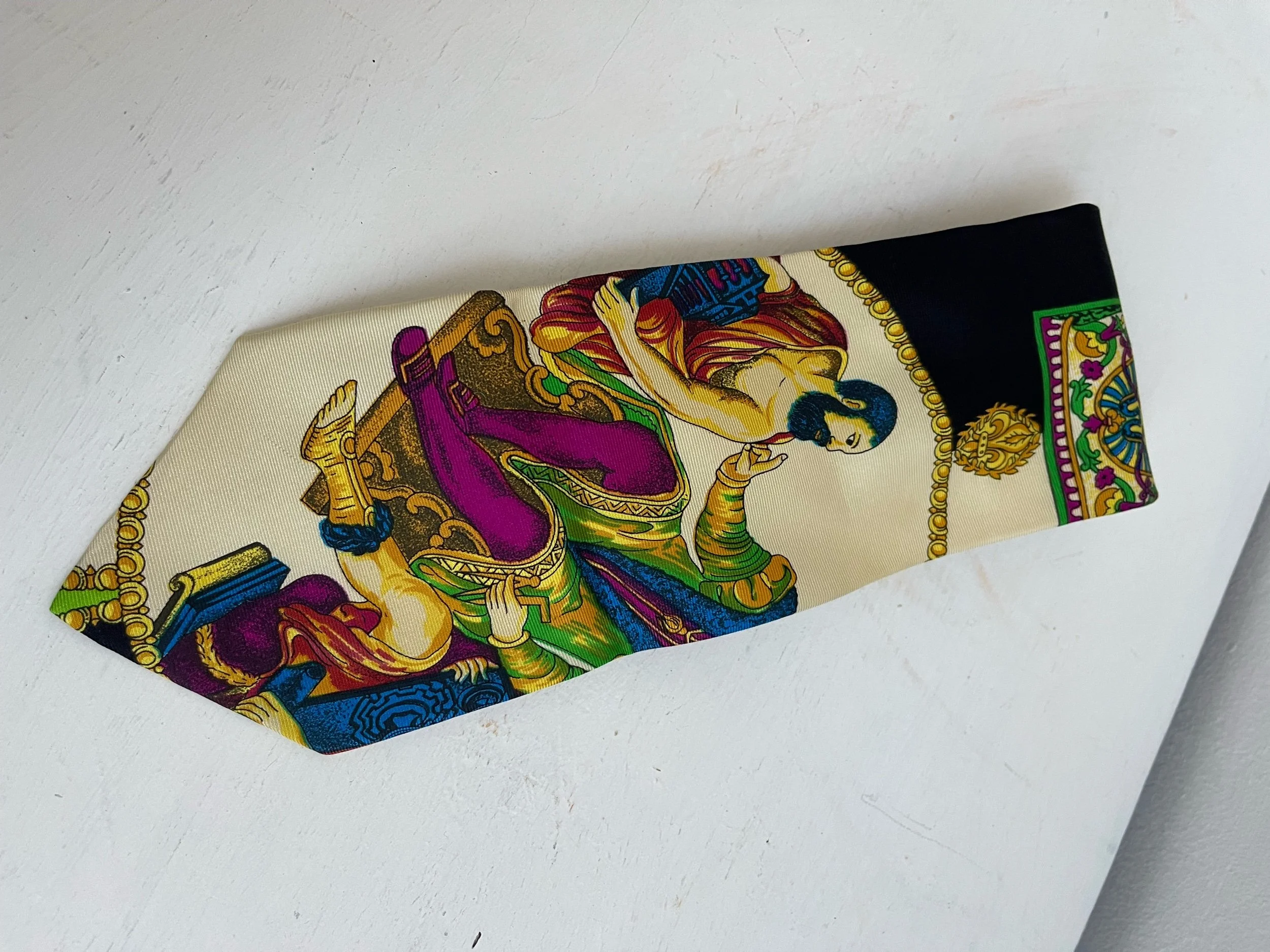 A striking Instante by Gianni Versace silk tie from the 1990s, showcasing an elaborate mythological and celestial design in vivid Versace colors — yellow, navy, emerald, fuchsia, and ivory. This rare vintage piece embodies the bold artistic flair and luxury craftsmanship that defined Versace’s early collections.
