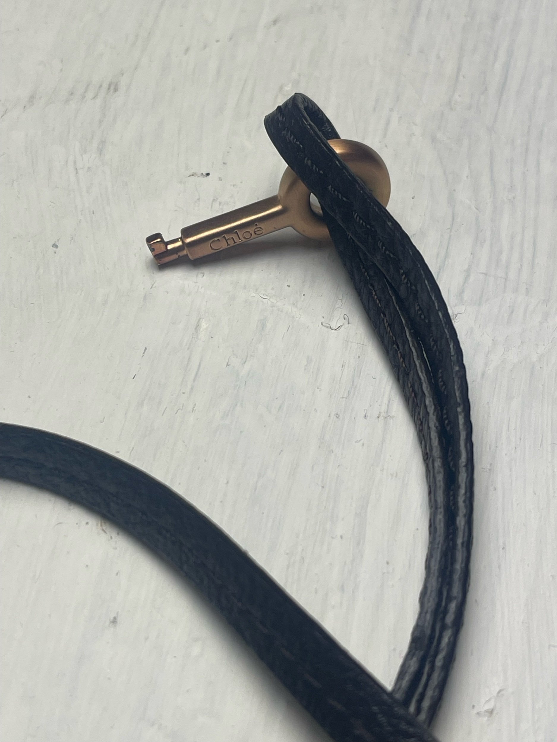Crafted in 100% full-grain calf leather (vachette pleine fleur), this compact yet statement-making piece features the signature brass padlock and key detailing—an emblem of Chloé’s early 2000s cult classics. The antique gold-tone hardware, double buckle accents, and rich pebbled leather texture give it a timeless, edgy sophistication.