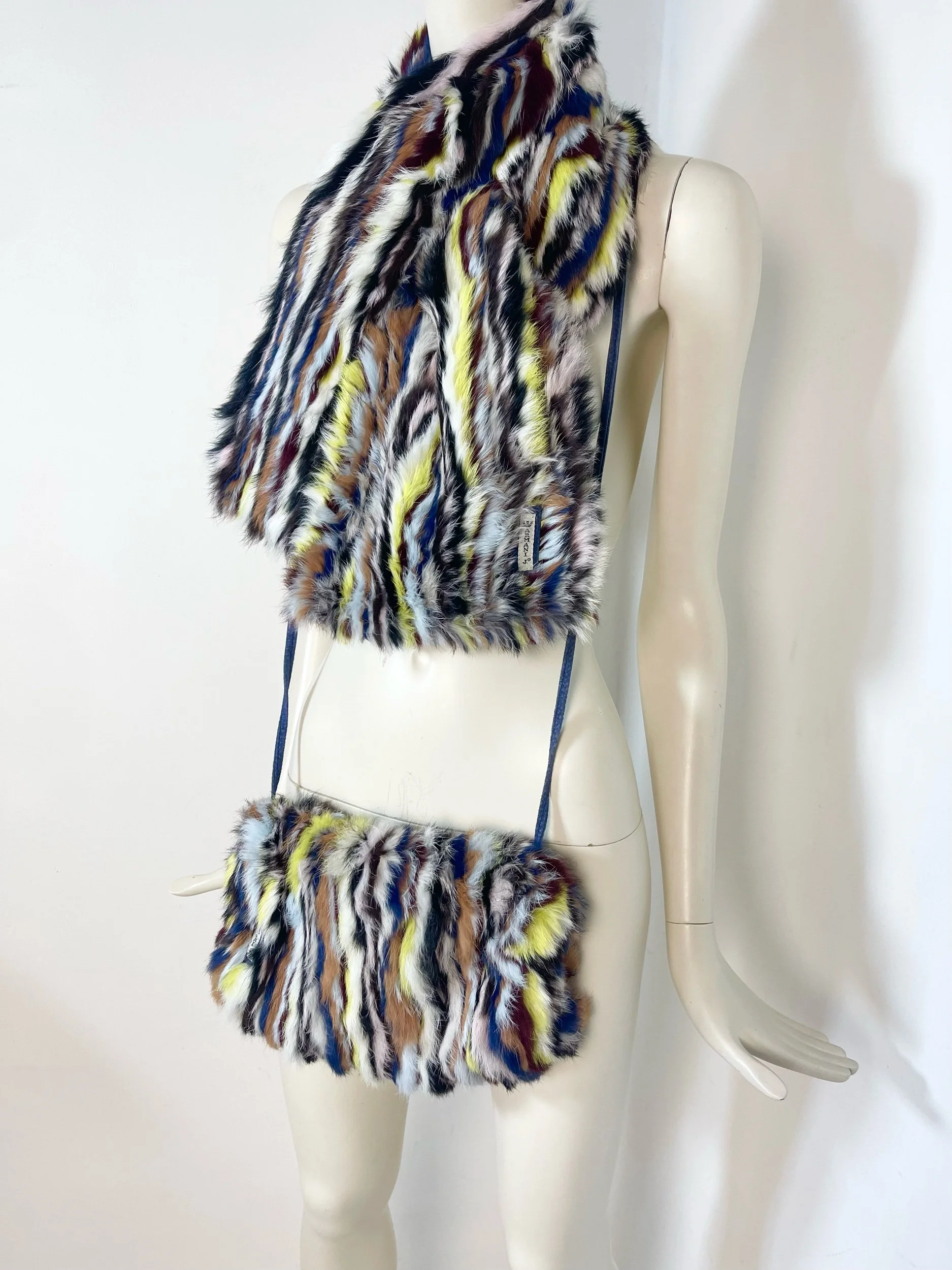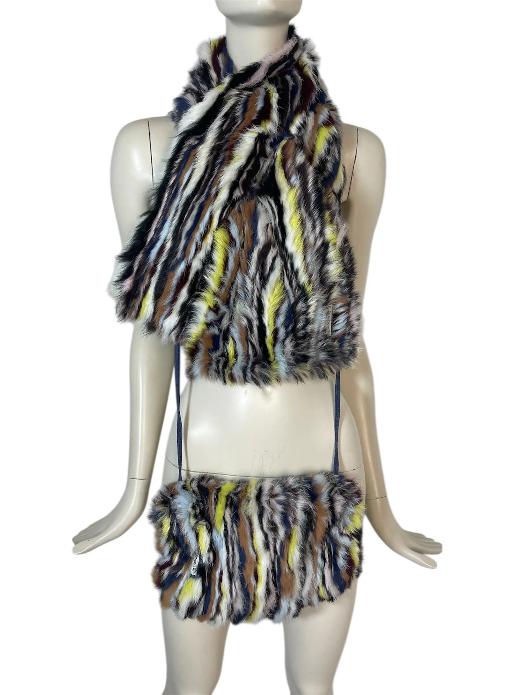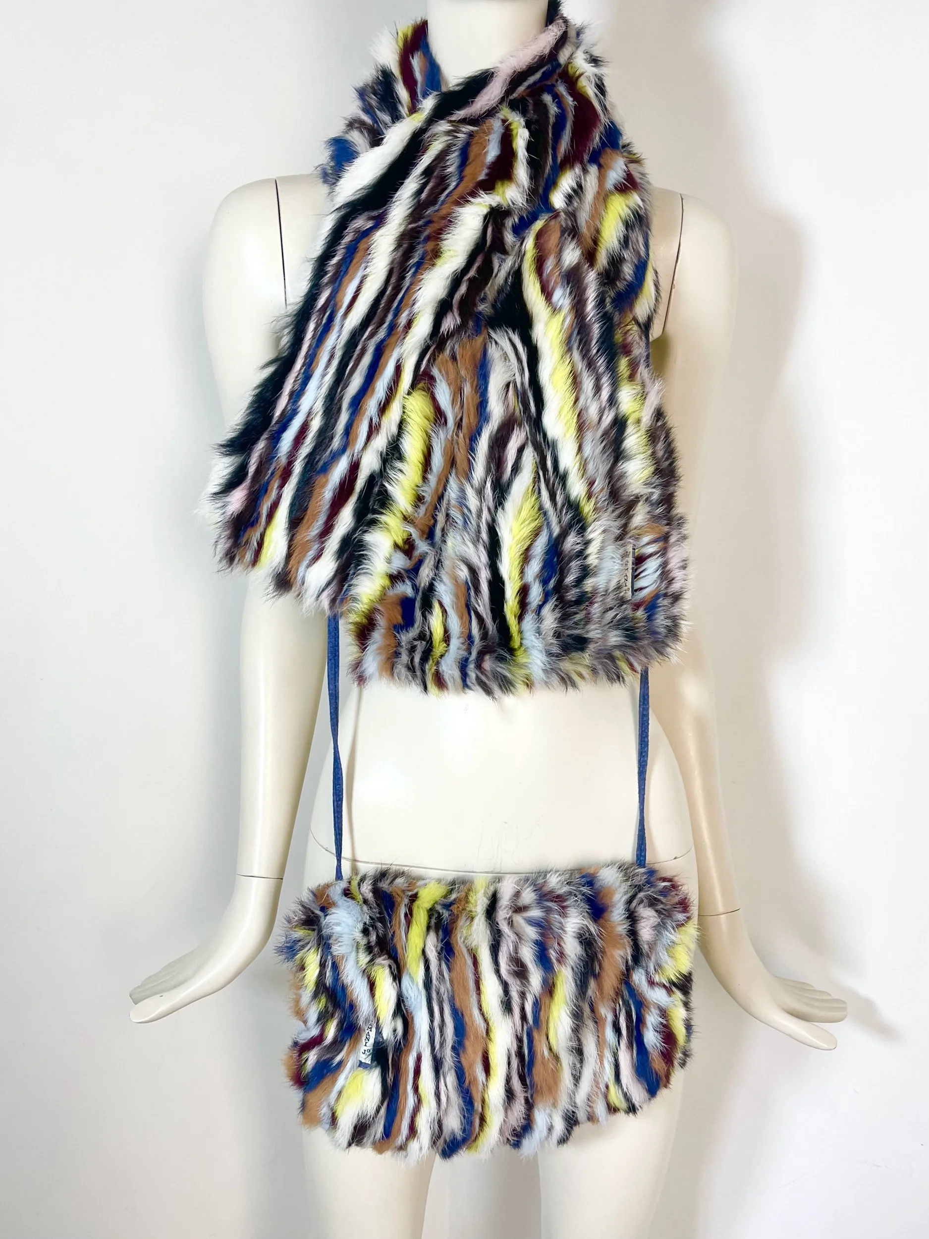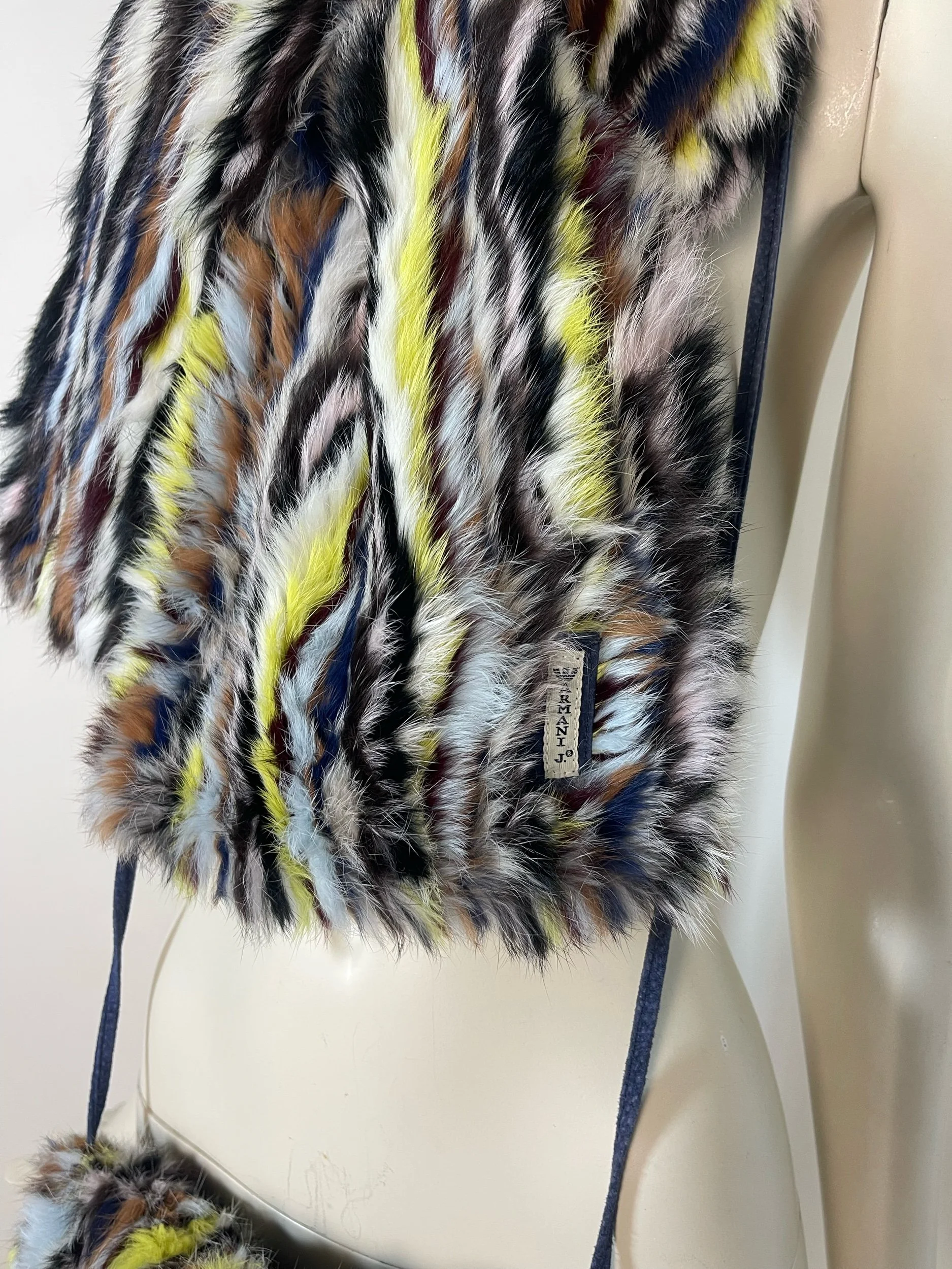 Step straight into the bold, eclectic energy of the early 2000s with this authentic vintage Armani Jeans fur scarf and matching muff. Crafted from luxuriously soft rabbit fur, this rare set features a striking multicolor striped pattern—mixing cobalt blue, soft pink, rich brown, yellow, black, and white for an unmistakably Y2K look.