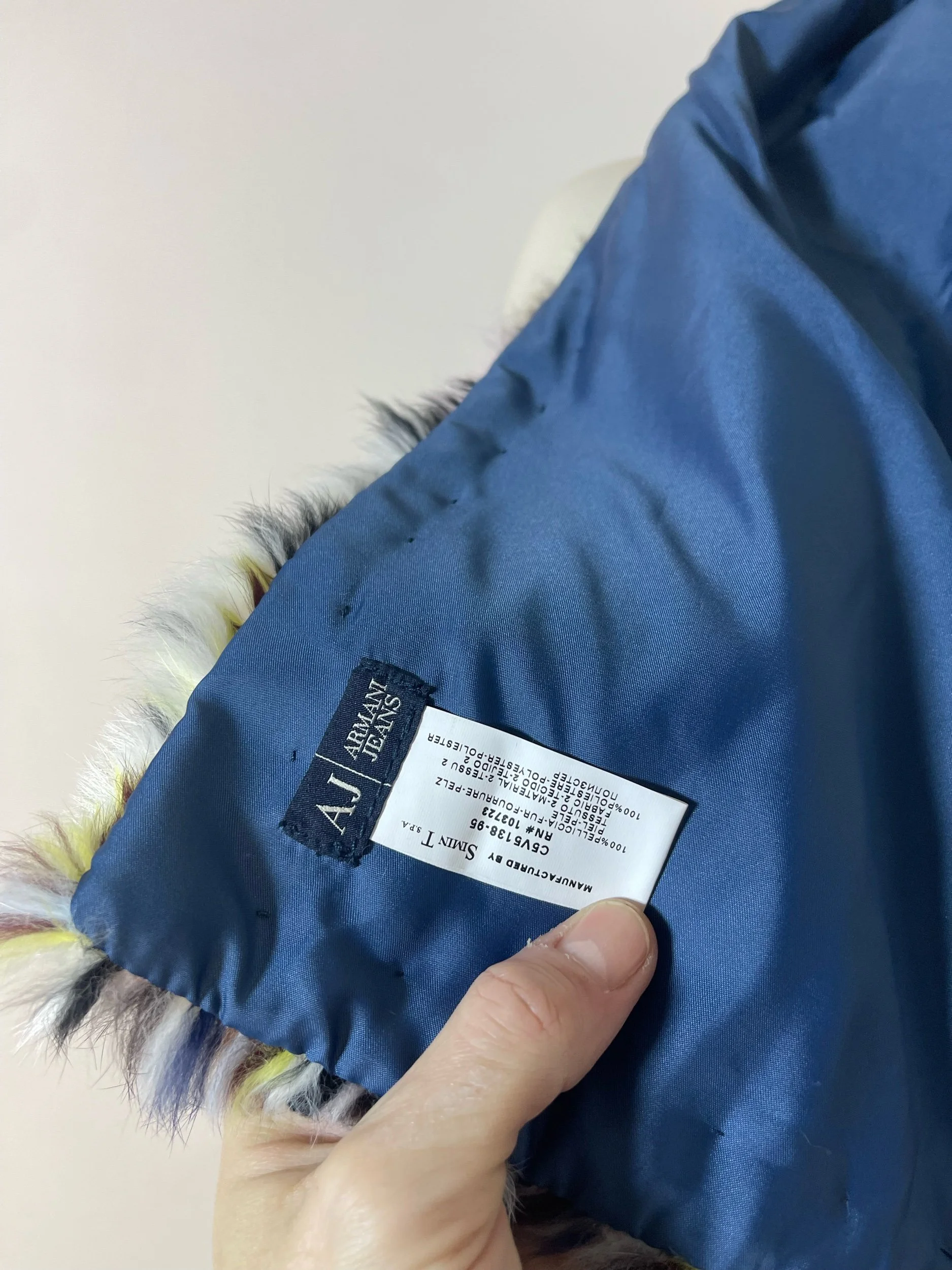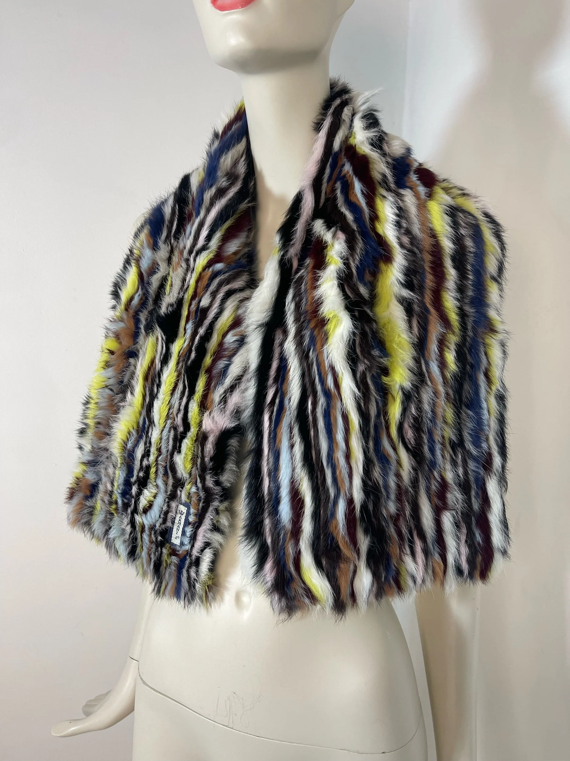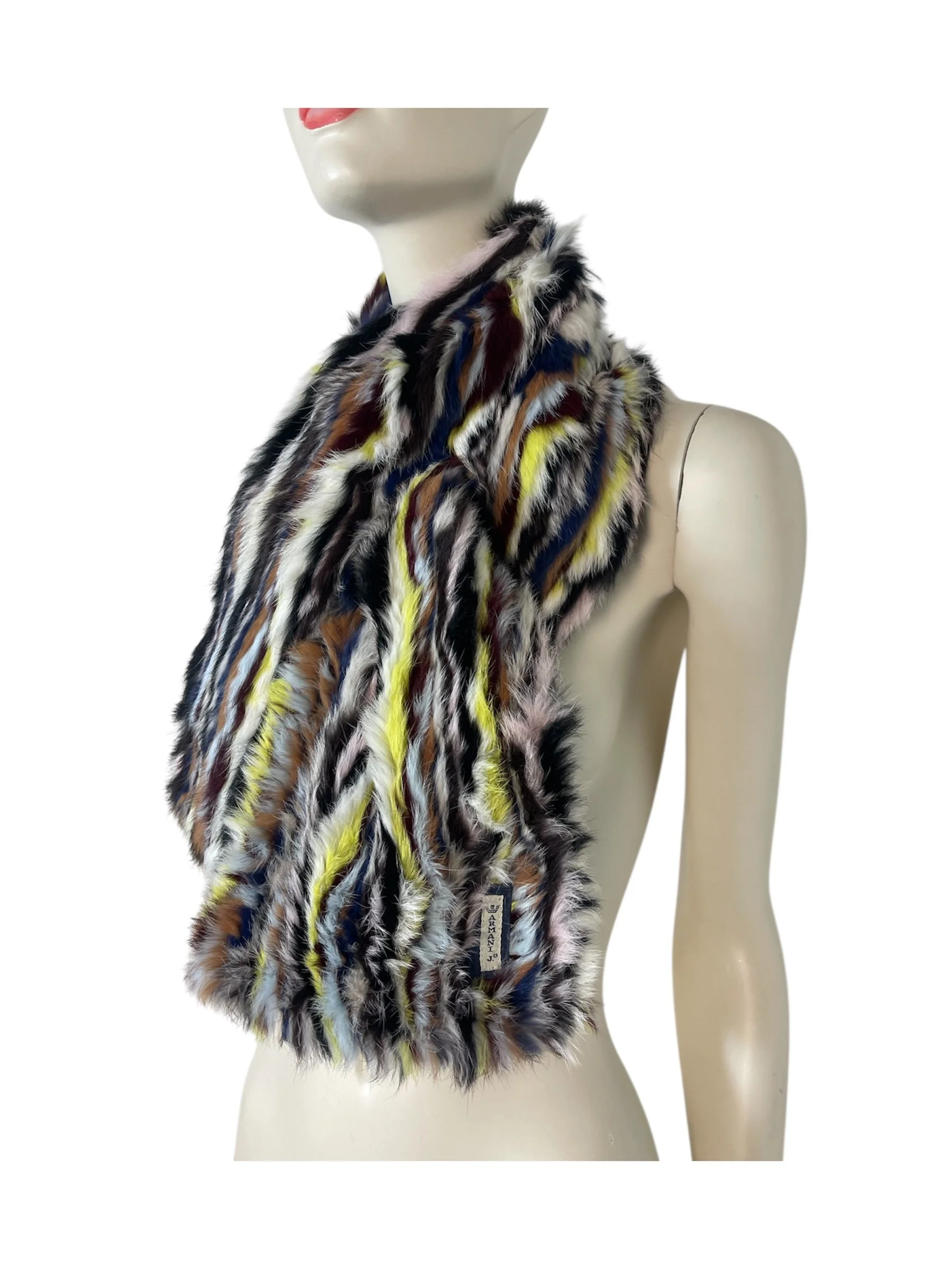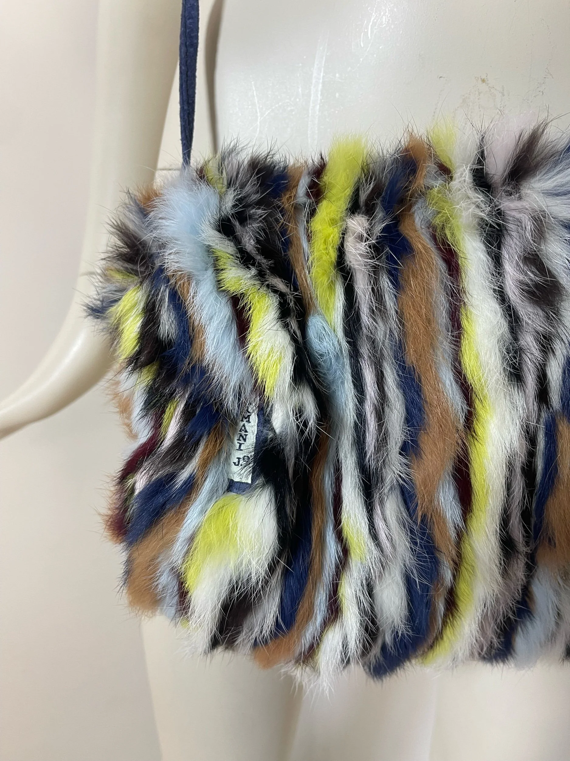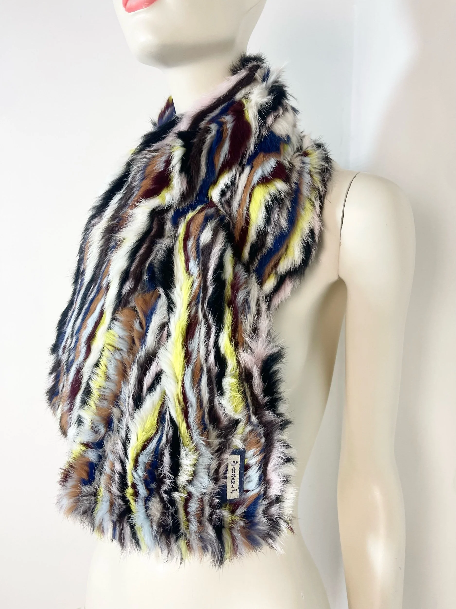 Step straight into the bold, eclectic energy of the early 2000s with this authentic vintage Armani Jeans fur scarf and matching muff. Crafted from luxuriously soft rabbit fur, this rare set features a striking multicolor striped pattern—mixing cobalt blue, soft pink, rich brown, yellow, black, and white for an unmistakably Y2K look.