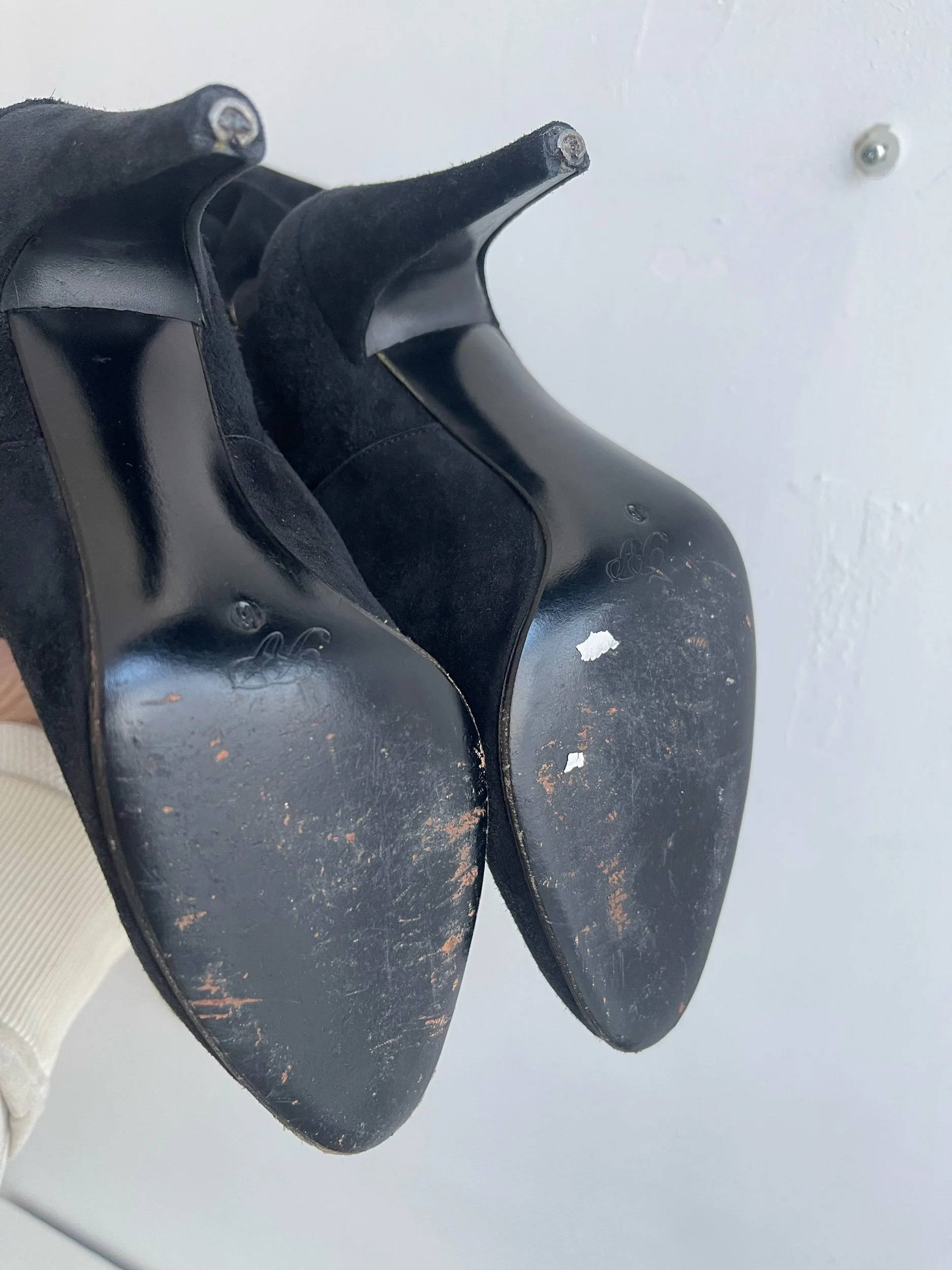 Step back into the glamour of the 1970s with these stunning suede balloon boots, a true vintage treasure. Crafted from soft, supple suede in a beautifully rich tone, these boots feature the distinctive rounded balloon silhouette that defined the era’s bohemian-chic style. A gold leather tassel adds just the right touch of luxury and playful movement.