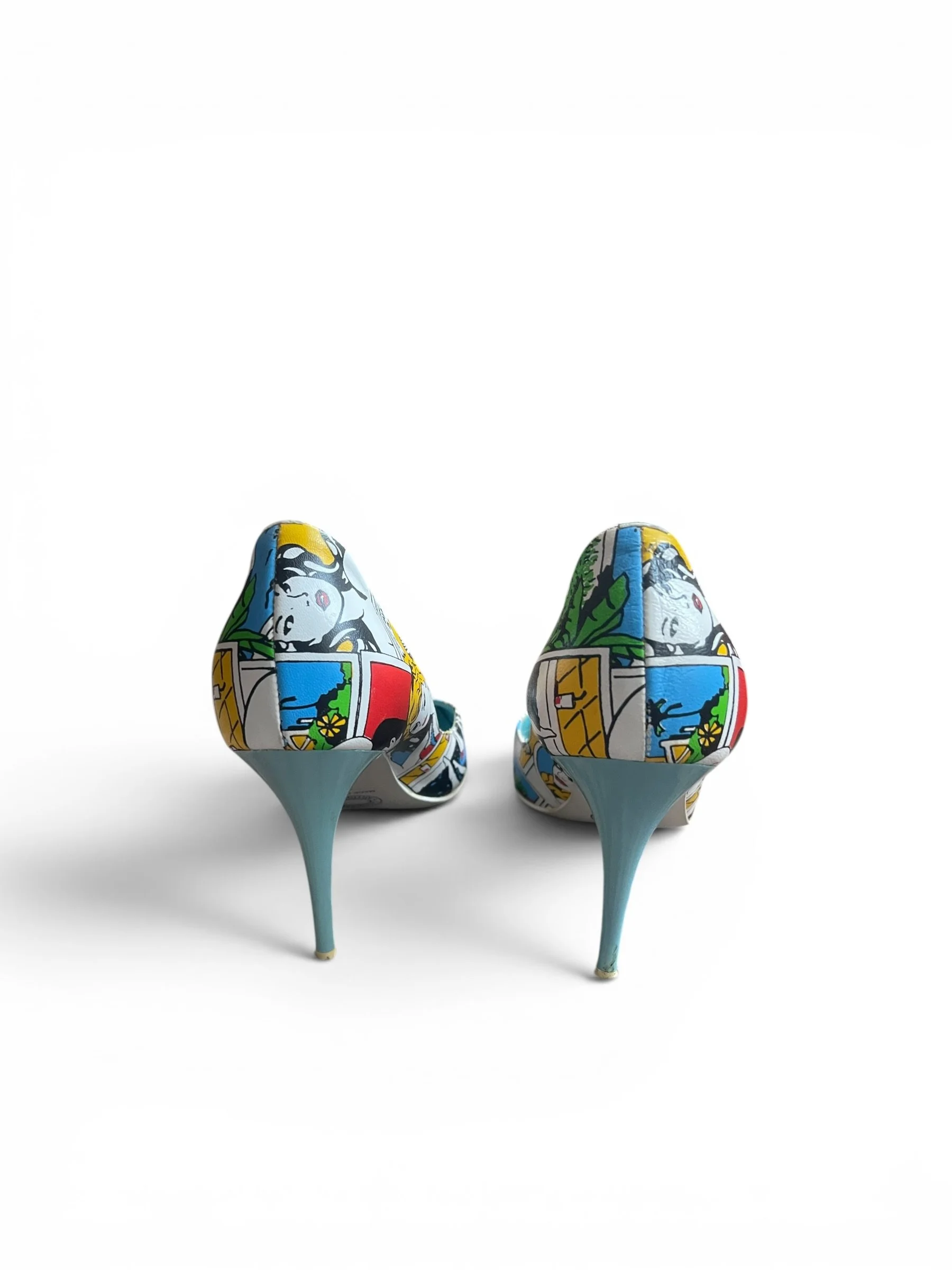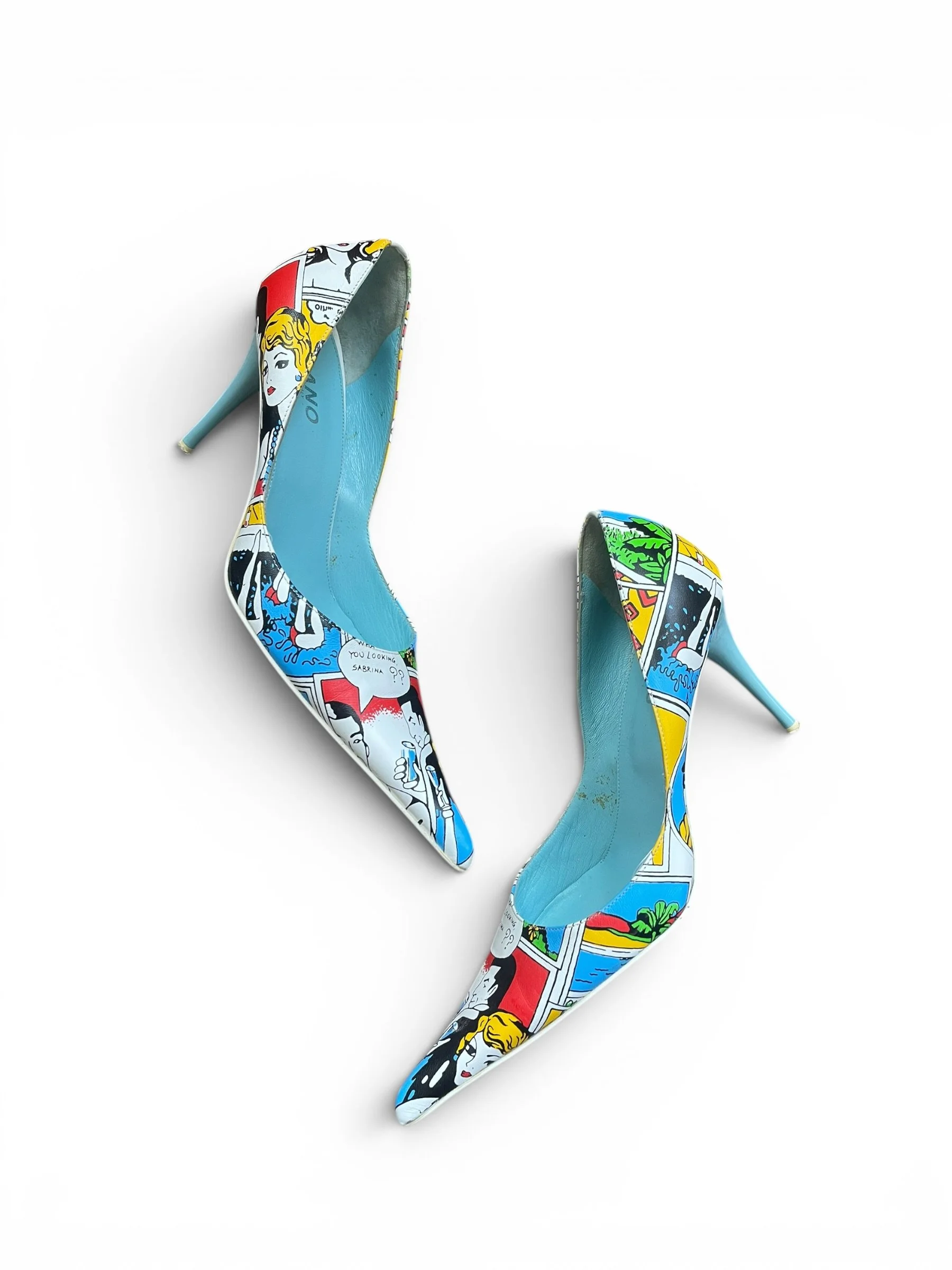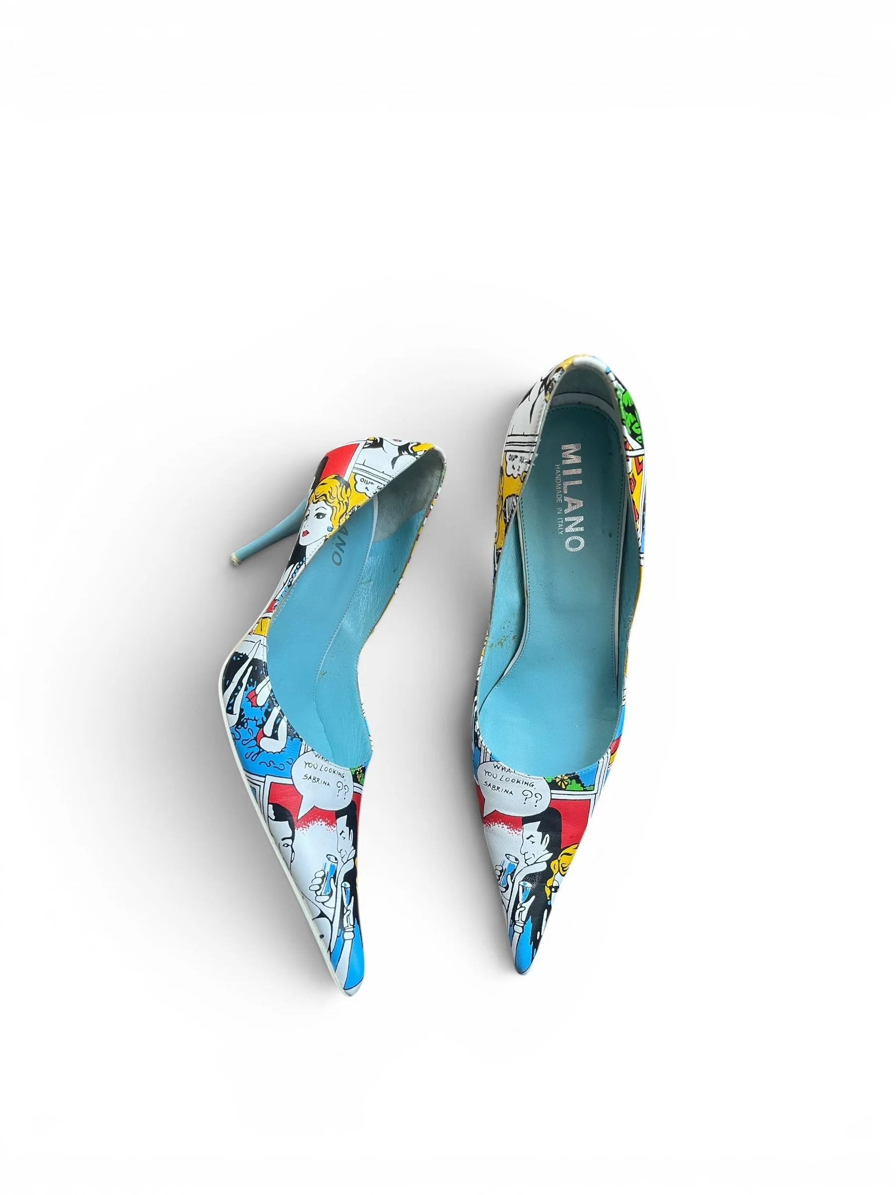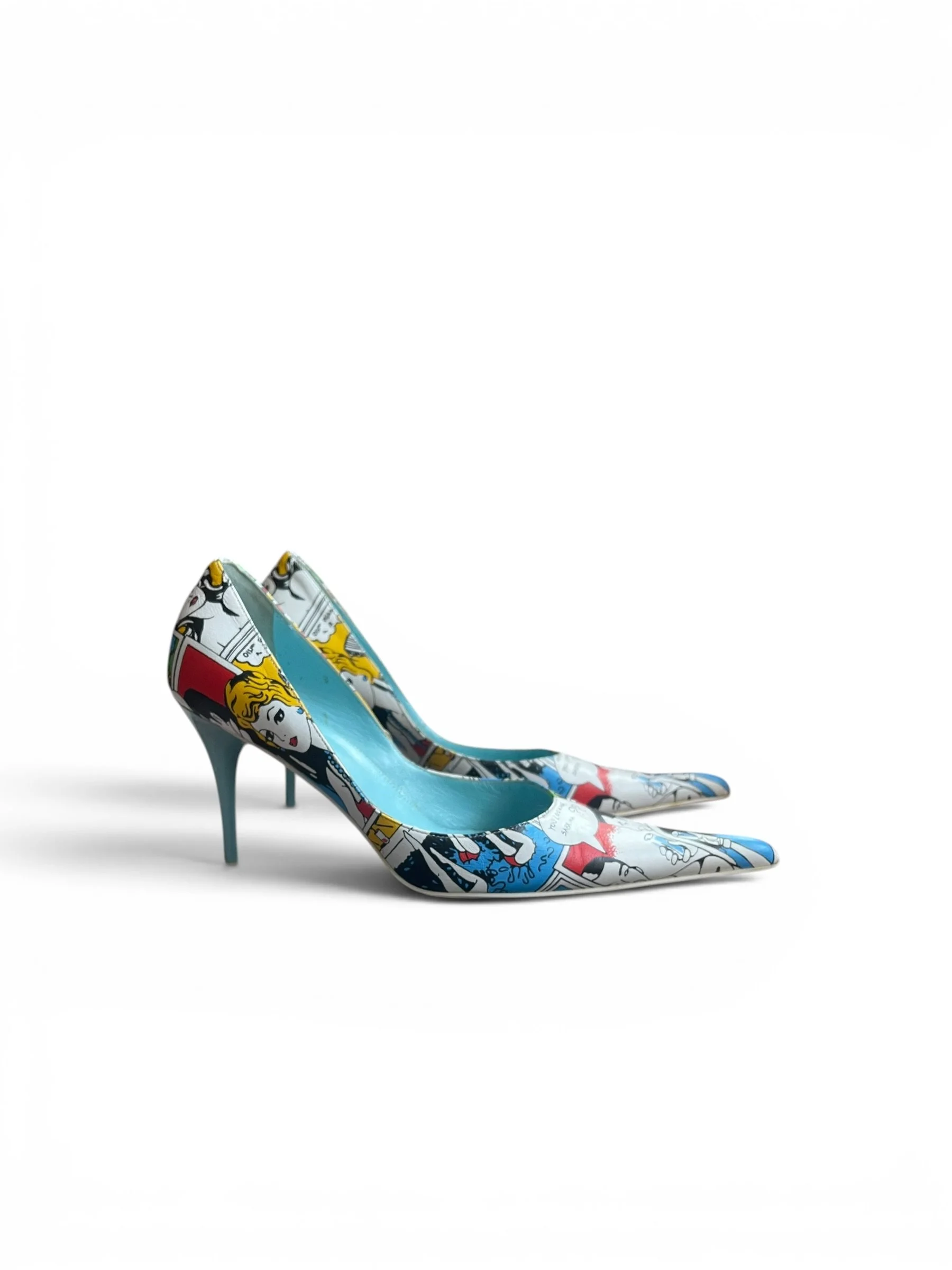 Rare vintage early-2000s pointed-toe stiletto pumps by Milano, handmade in Italy. Genuine leather uppers with eye-catching pop art/comic print design and turquoise blue leather interior. Classic sleek Y2K silhouette with slim heels.