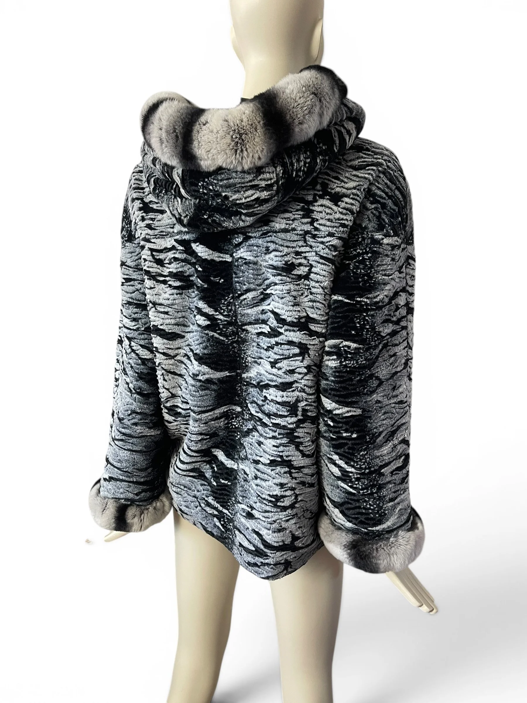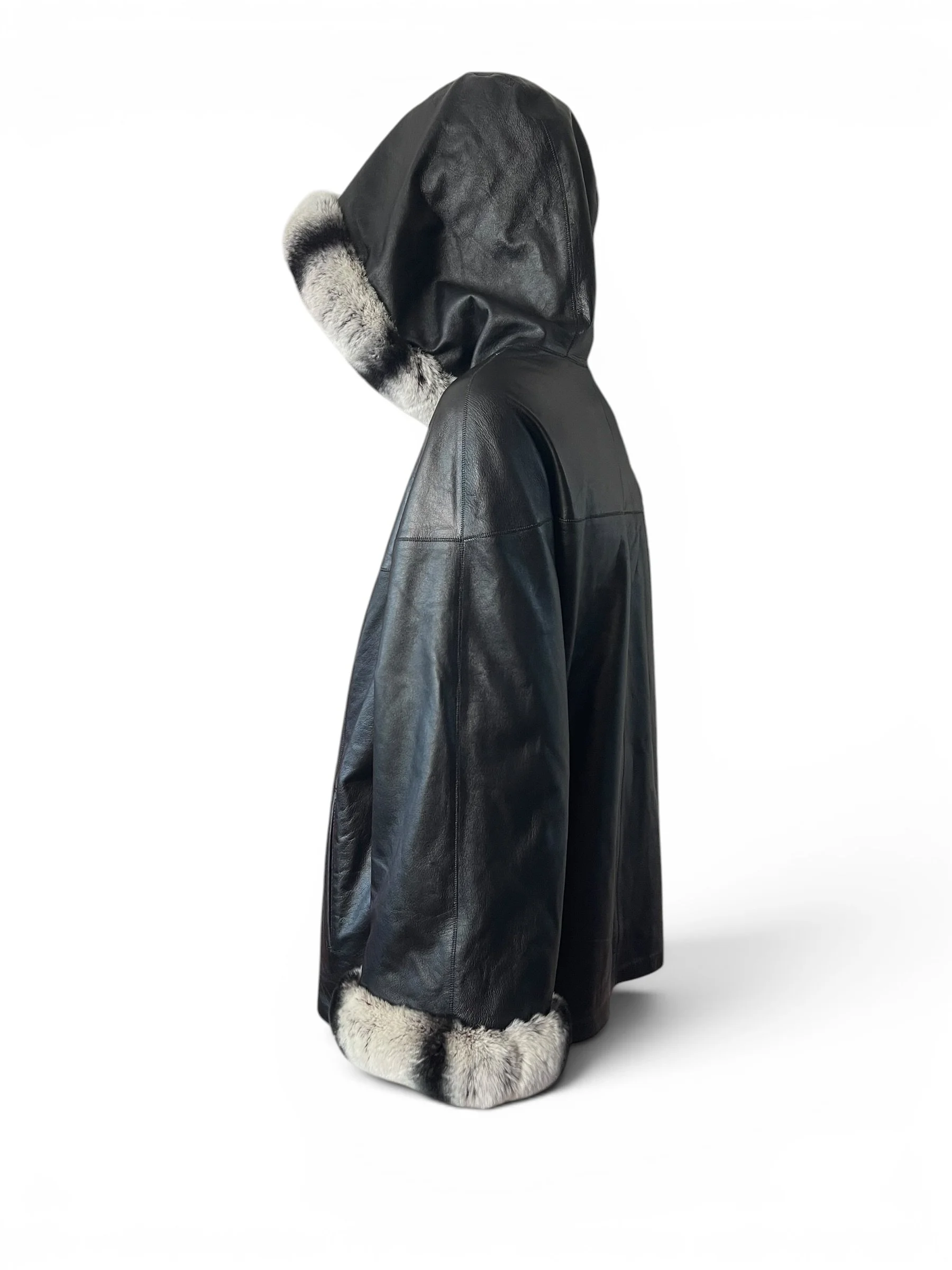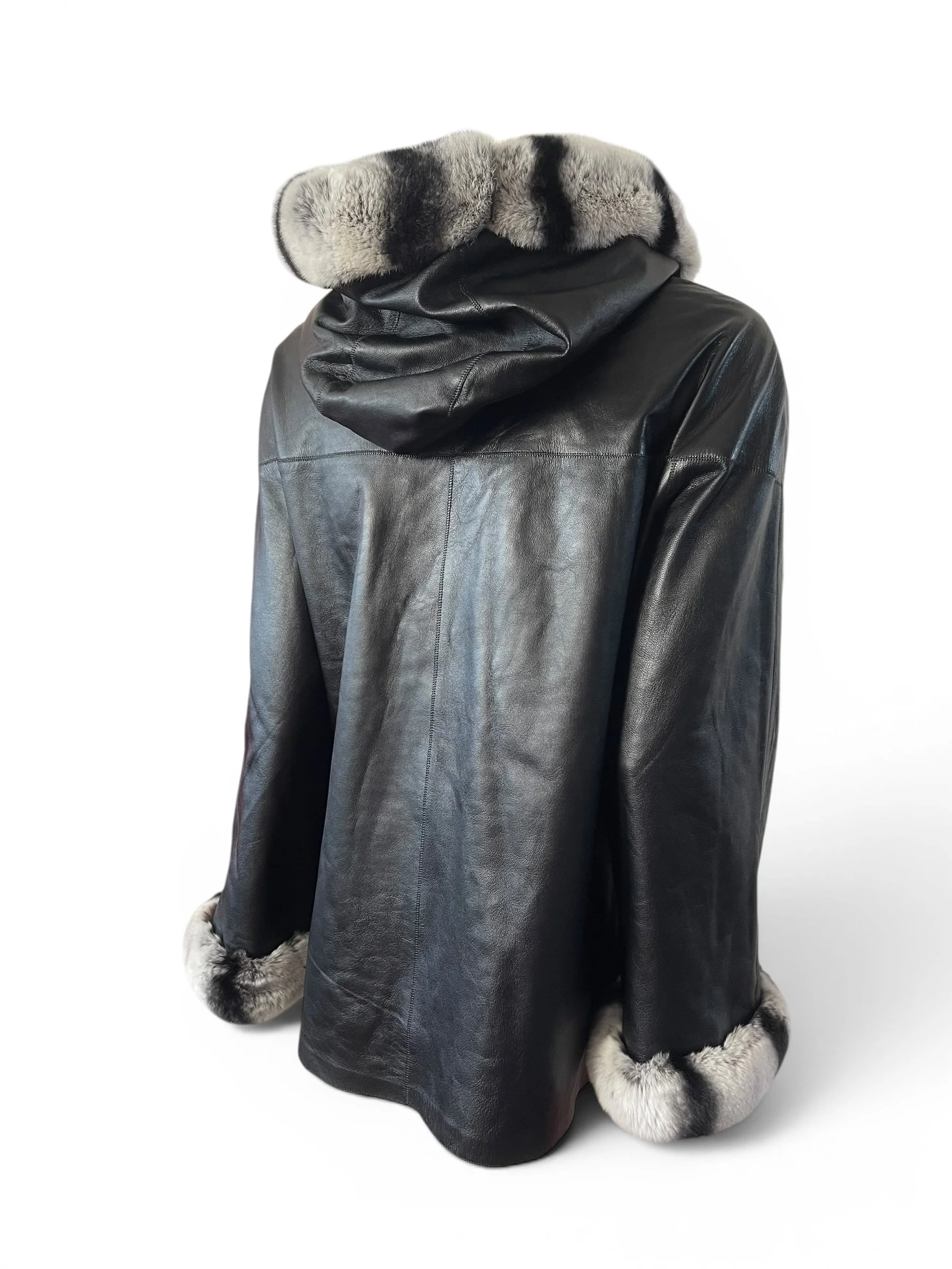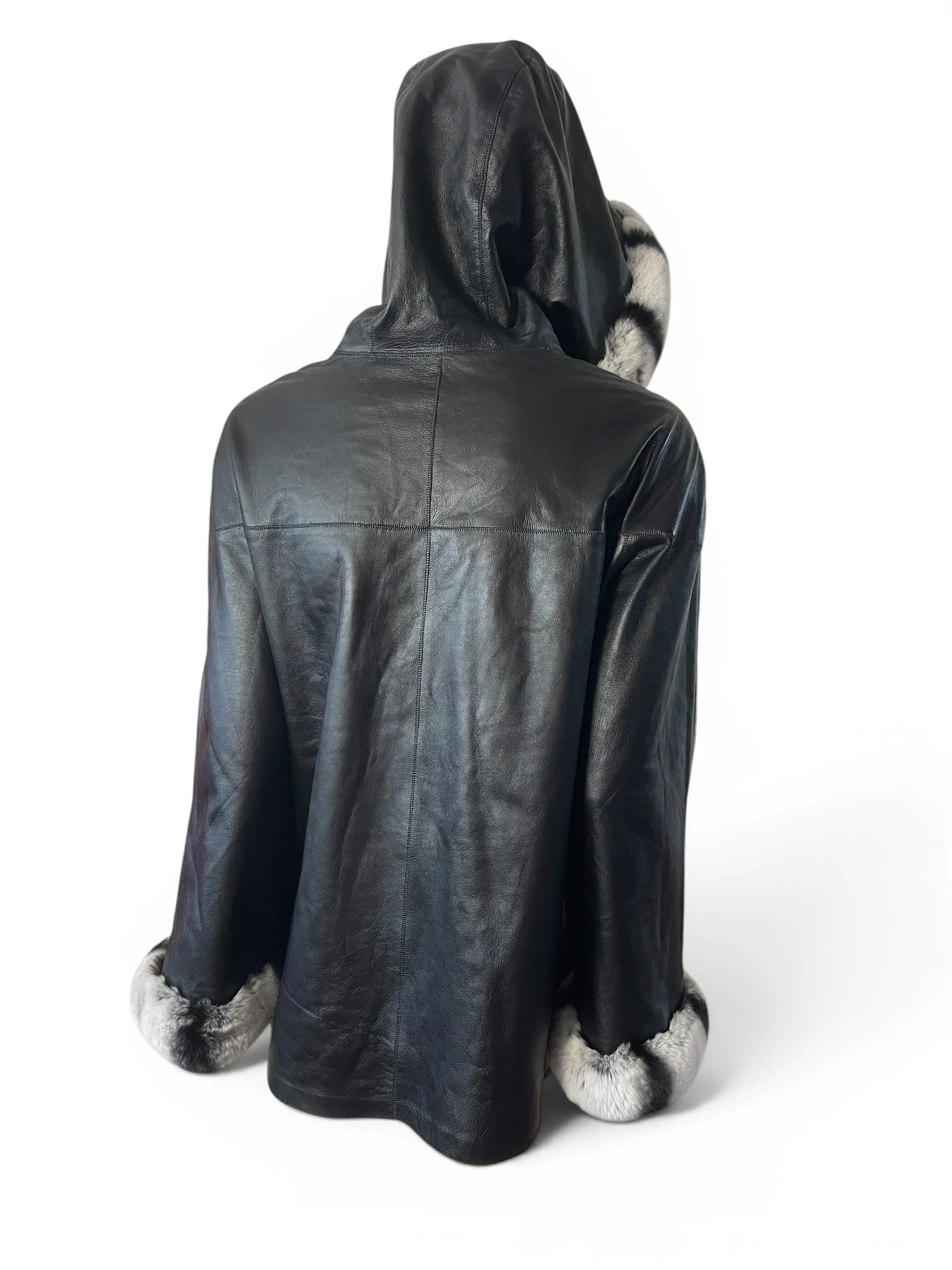The piece is elevated with genuine chinchilla trim along the hood and cuffs, adding a refined touch of texture and warmth. The relaxed silhouette and hooded design make it as practical as it is elegant—perfect for transitioning from day to evening.