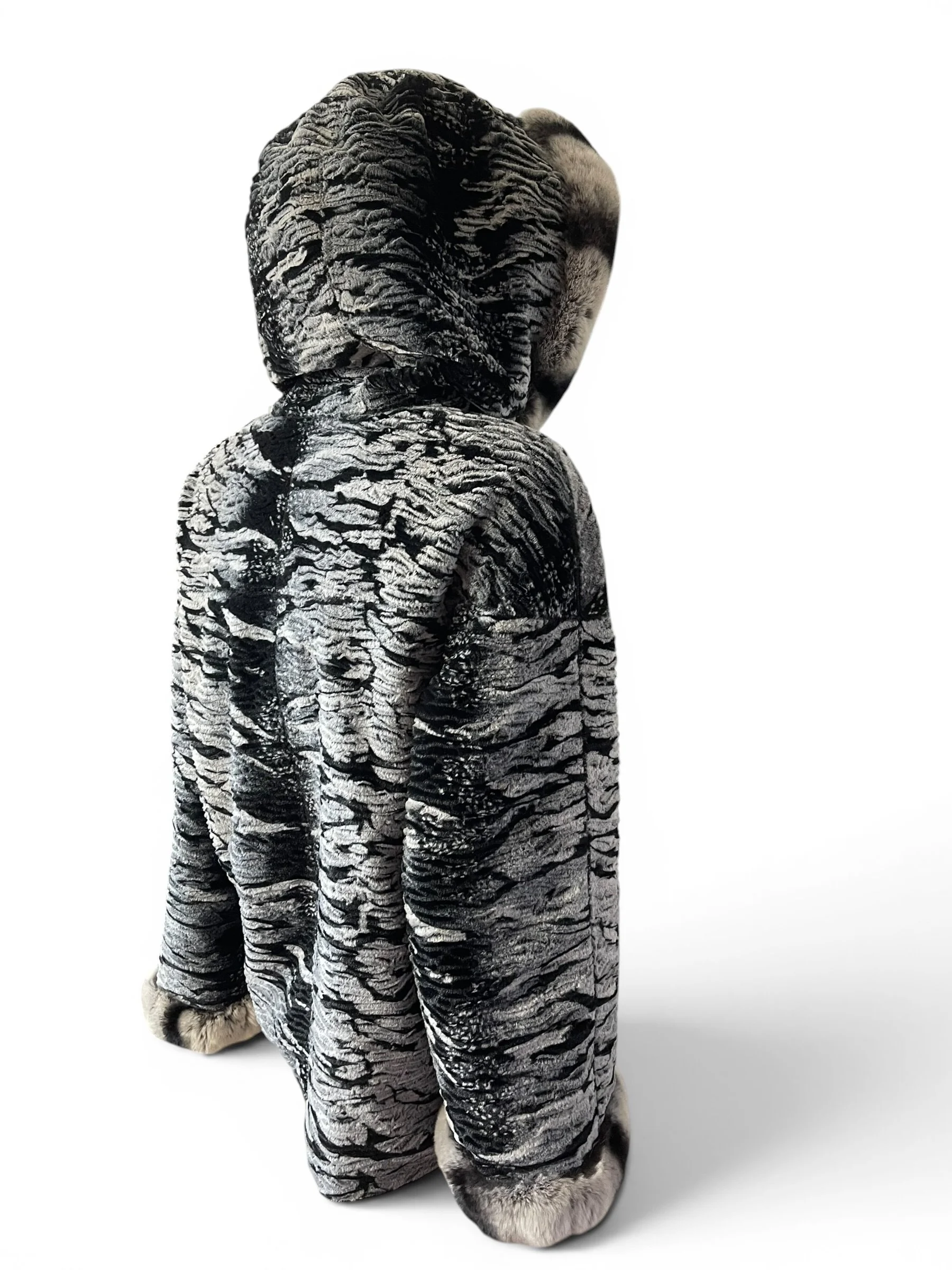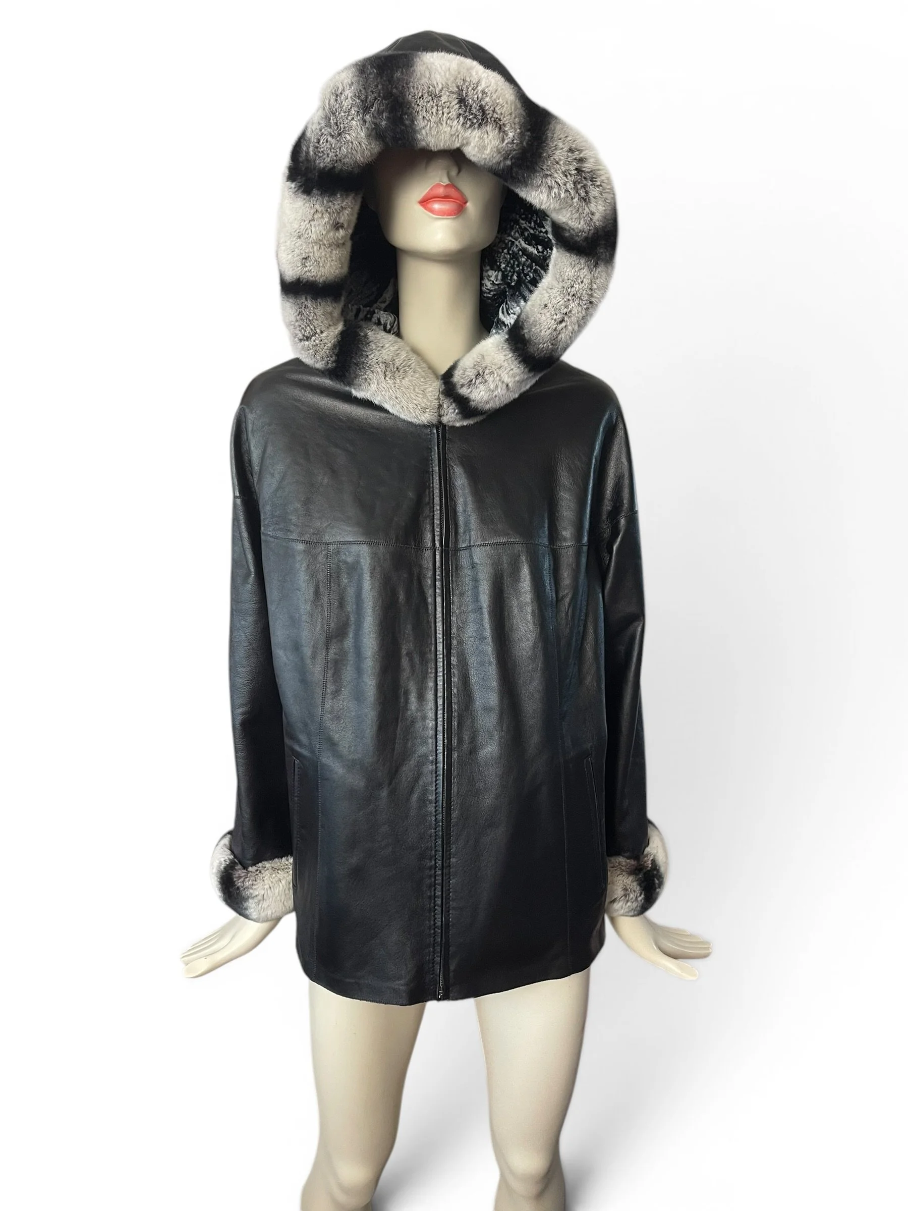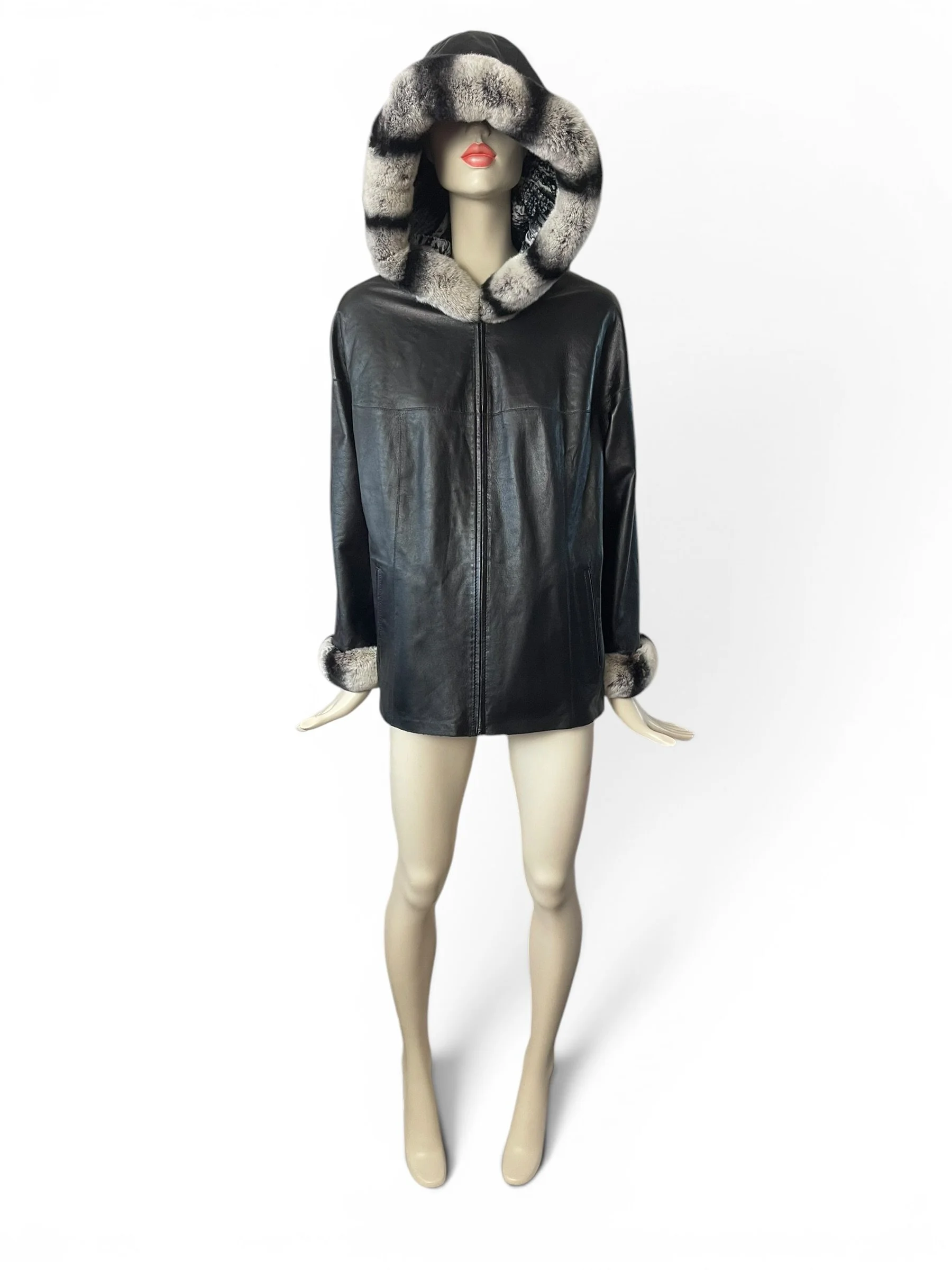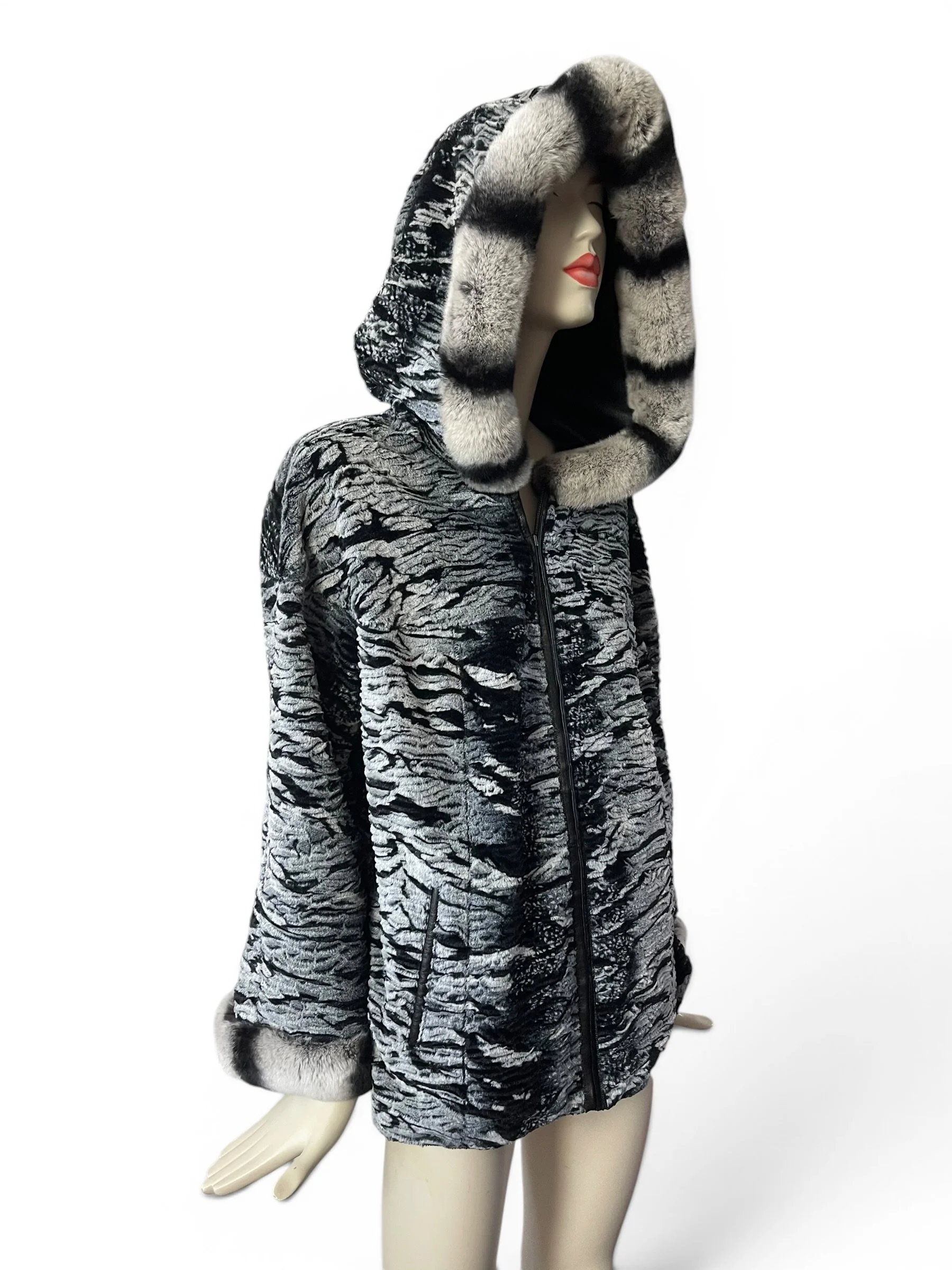 The piece is elevated with genuine chinchilla trim along the hood and cuffs, adding a refined touch of texture and warmth. The relaxed silhouette and hooded design make it as practical as it is elegant—perfect for transitioning from day to evening.