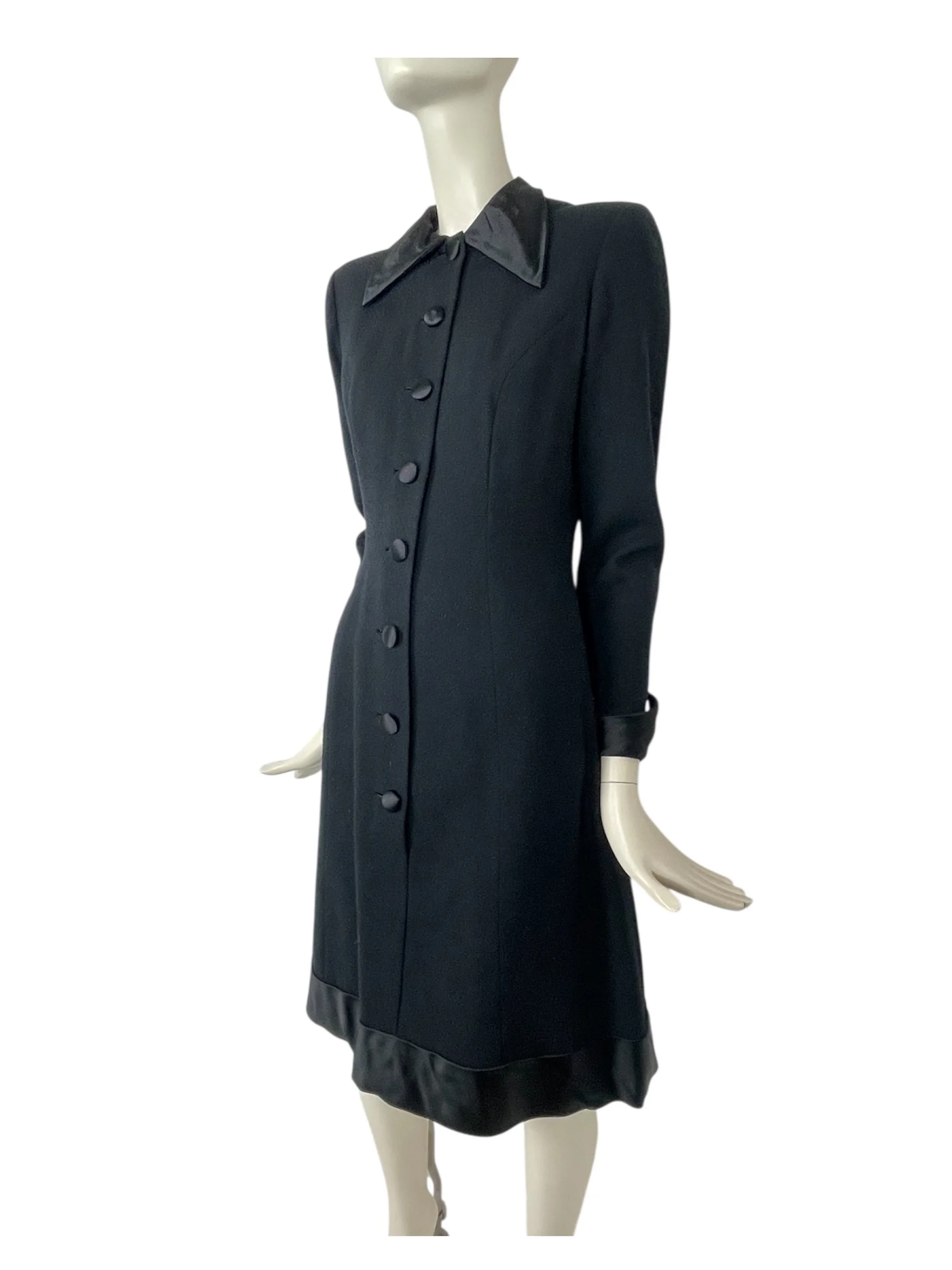 ✨ Vintage 1960s–70s Pauline Trigère Black Wool Dress with Satin Trim – Fits UK 8 ✨